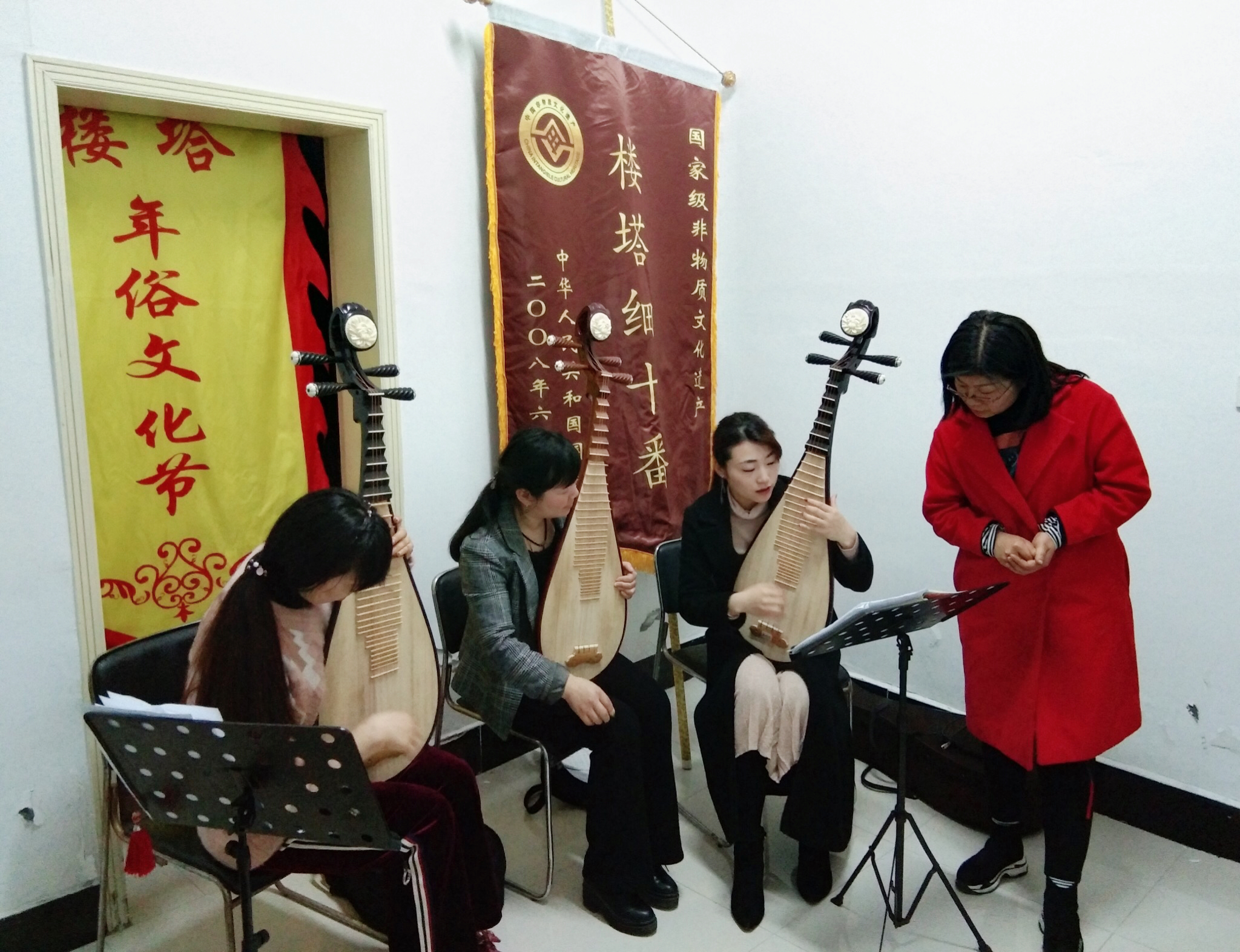 2019年,是学院在萧山区楼塔镇设立“非物质文化遗产教学实践基地”的第四年,也是与楼塔镇人民政府签订《关于国家级非物质文化遗产——楼塔“细十番”保护传承弘扬协议三年计划》的推进年。为积极践行“志愿服务+项目共建”的校地合作,根据地方文化特色与实际需求,文化管理系主任谢青赴楼塔开讲公开课《民族乐器演奏技法——以楼塔“细十番”为例》。他以楼塔“细十番”一套三曲为例向传承人们讲述了乐器演奏的基本技巧、十番音乐的形象和规律特点等,通俗易懂、幽默风趣。传承人们边听边记,收获满满,意犹未尽。系青年教学实践志愿服务团教师宋煜也积极投身于楼塔细十番琵琶乐器教学中,利用周末时间赴楼塔镇开展细十番的分声部教学,她结合初学者常常遇到的学习误区与乐曲演奏的韵律训练,认真耐心的讲解示范,深受学员好评。