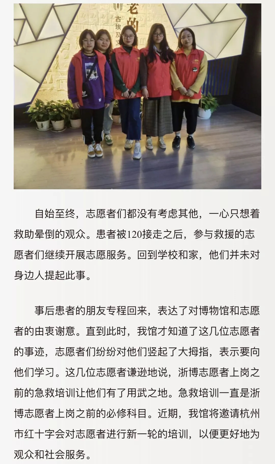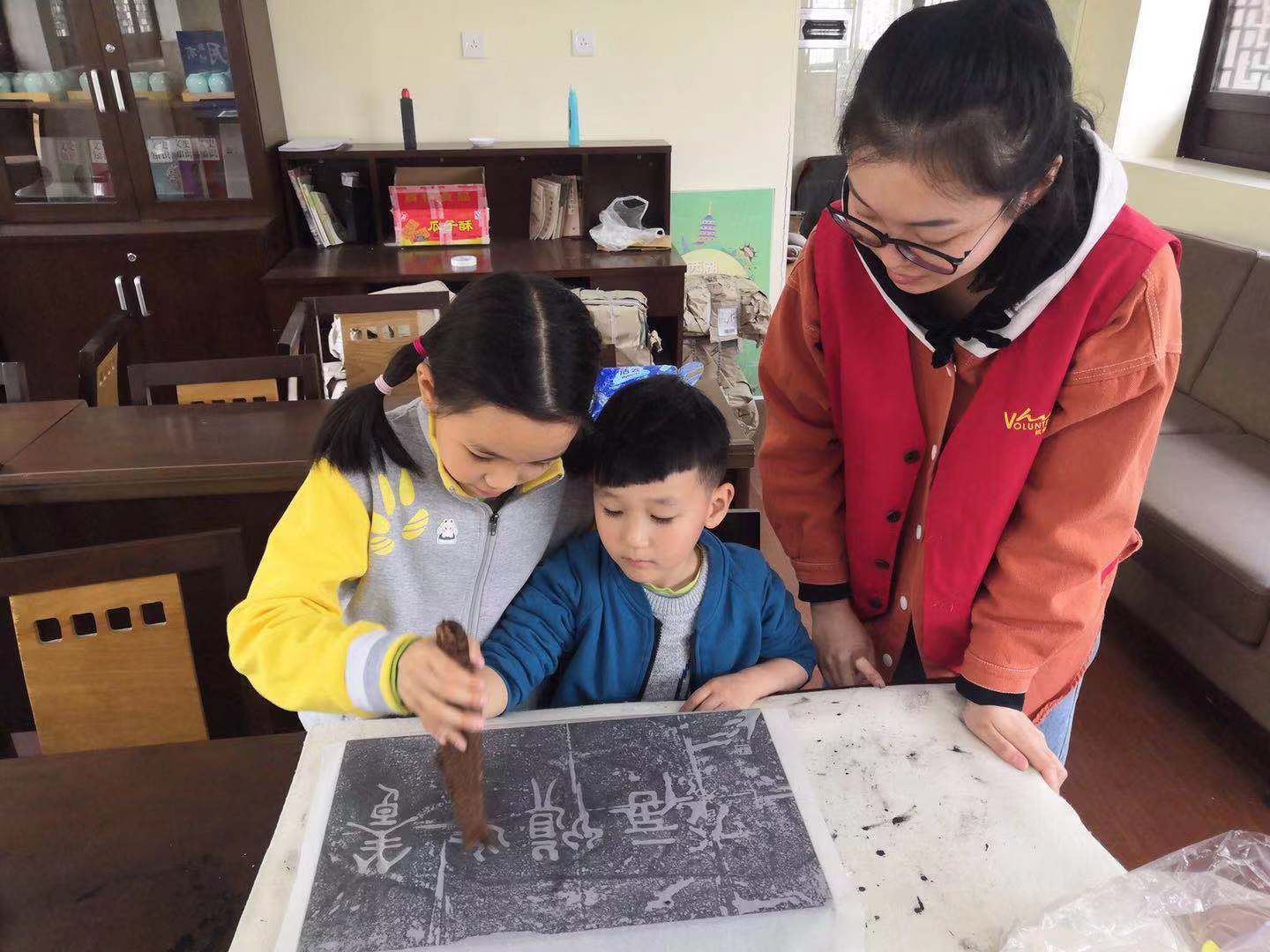 文化管理系的学生志愿者们则有的在图书馆内协助管理人员进行图书分类、上架摆放,协助小读者们养成良好的阅读习惯;有的在西湖美术馆的古埃及文明展向参观者们分发展览小册子、讲解关于古埃及文明的历史、象形文字、木乃伊等,使参观者更好的领略“法老的国度”;有的在名人纪念馆第二课堂给小朋友们介绍和示范如何拓印;有的在献血站为大家普及献血知识,为献血者们做好服务;有的在低碳科技馆内向游客进行低碳知识及展品的讲解,对展品进行操作演练或针对展品为观众提供咨询答疑服务等等。值得一提的是,我系18级民族传统技艺班的牟紫薇和余佳盈同学在古埃及文明展志愿服务时,还救助了一位晕倒的参观者,将其扶到志愿者休息室并加以安抚缓解,事后患者朋友专程赶回博物馆,表达了对志愿者由衷的谢意,浙江省博物馆还就此事进行了报道。