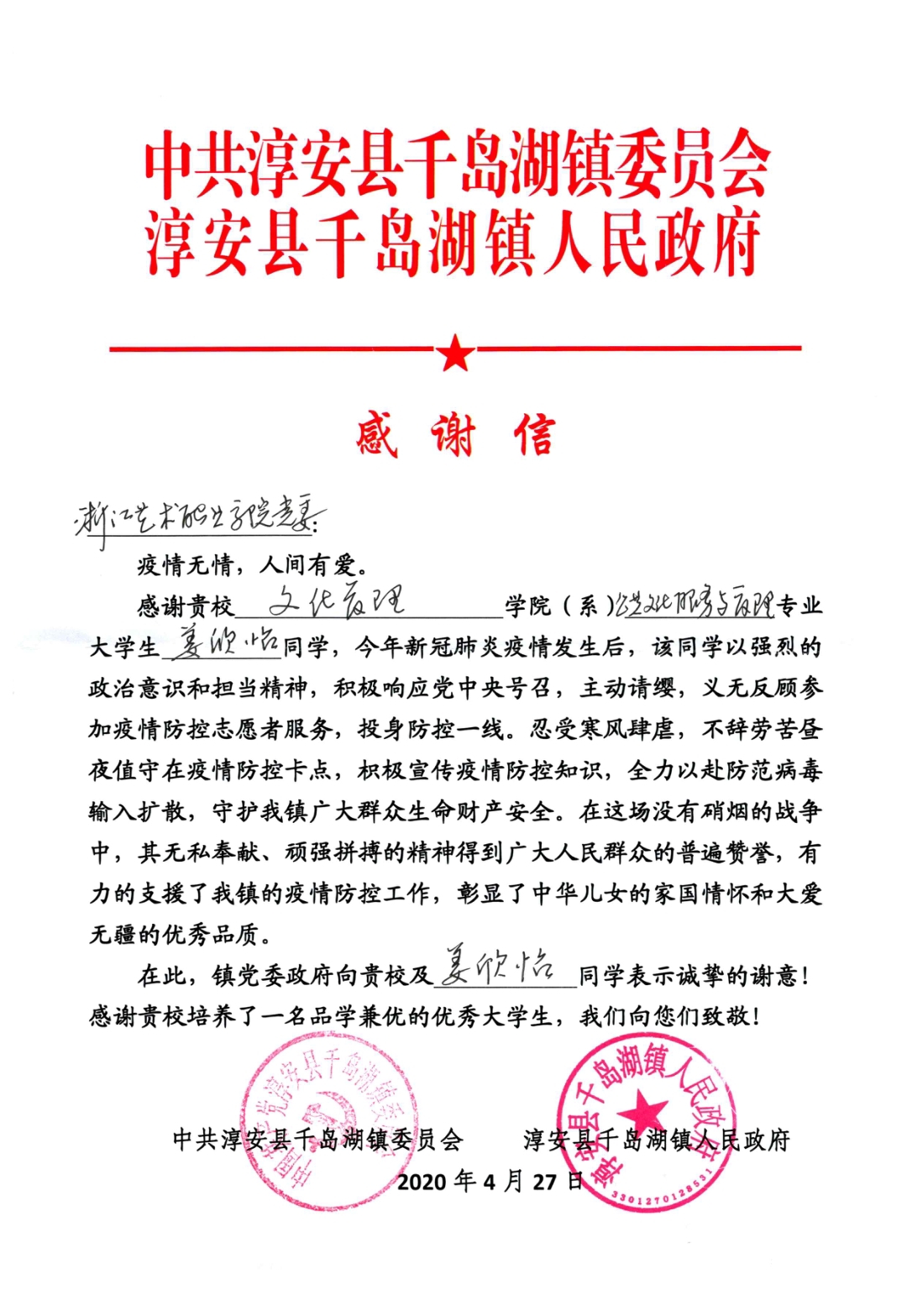 姜欣怡在她的志愿者队伍里是年纪最小的一个,却也是较为认真、能吃苦耐劳的一员。她很感激志愿者队伍中的长辈们带领她一起为千岛湖镇做贡献,同时她也希望自己能有更多的机会为群众服务,为千岛湖镇、为祖国的国泰民安和繁荣富强倾尽全力。