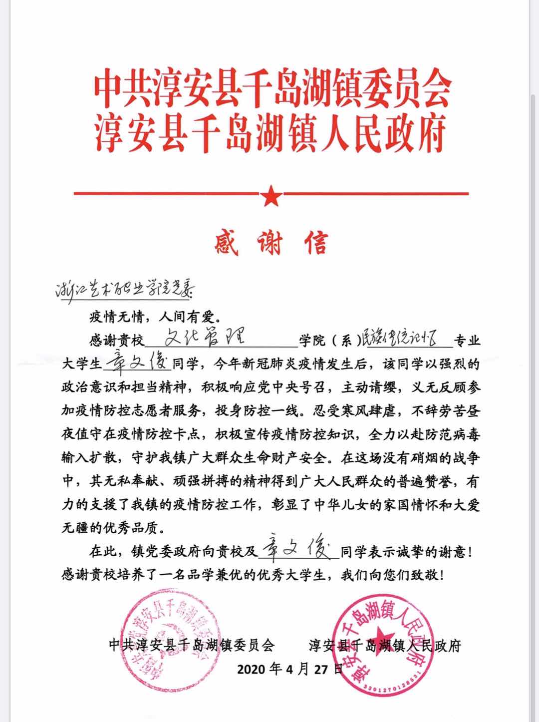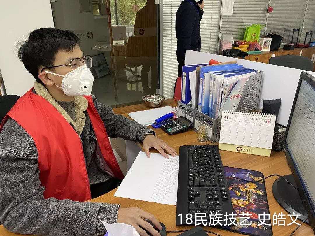 18展示班的洪波波,他以退伍军人的身份帮助木瓜村防疫抗疫,在卡点为村民测量体温,发放口罩,为村民讲解抗疫知识来增强村民的防范意识;18公共文化班的何金燕在平湖市西林寺社区居委会对社会外来人口入平进行登记;18传统技艺班史皓文也为杭州滨江区的丹枫社区做志愿服务。