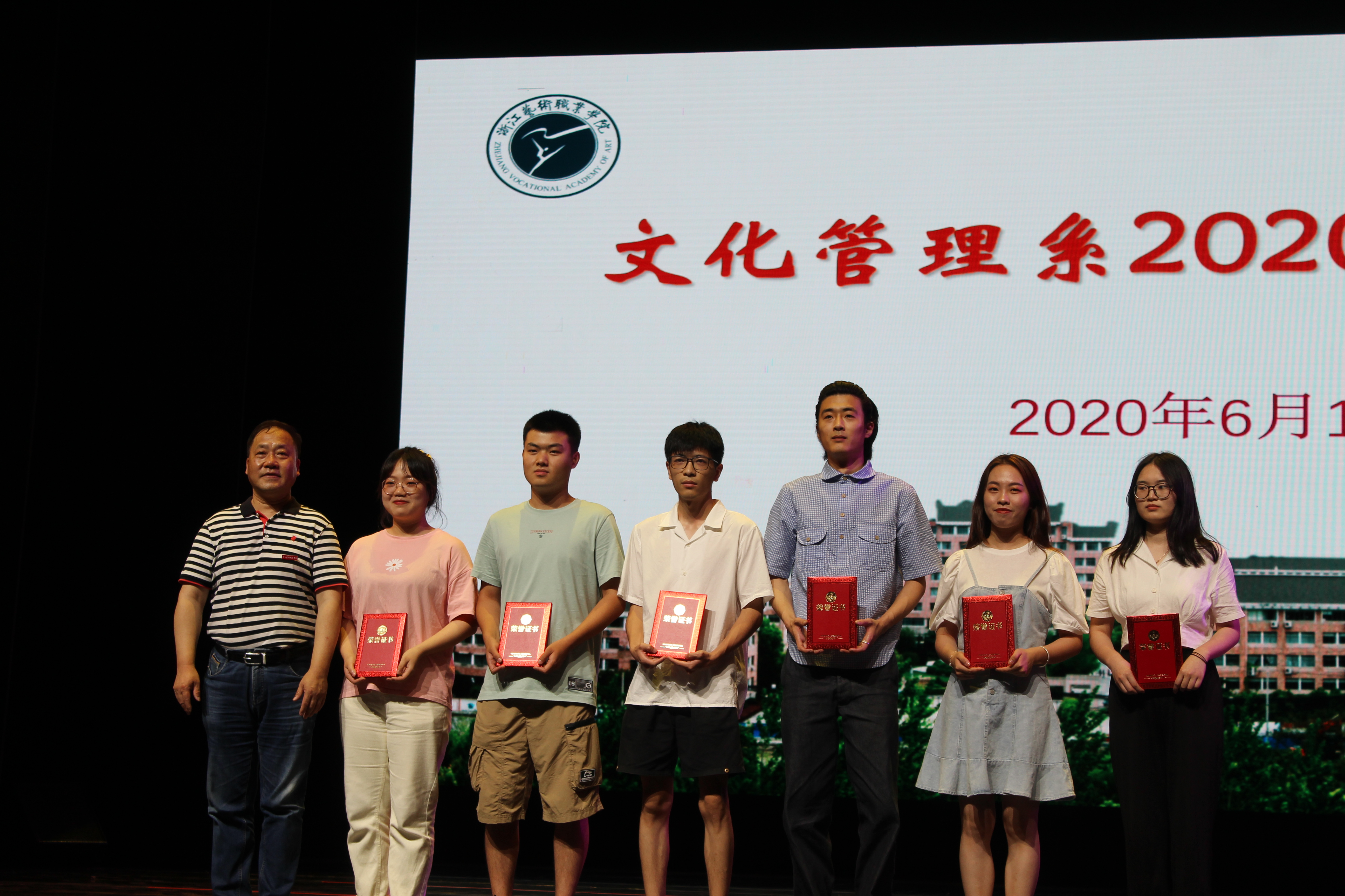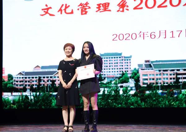 文化管理系班子分别为2019-2020学年综合展演季优秀学生、2020届优秀毕业论文、2020届院级优秀毕业生、省级优秀毕业生、国家奖学金获得者颁奖。毕业生有条不紊地上台领取他们大学三年的丰硕果实。