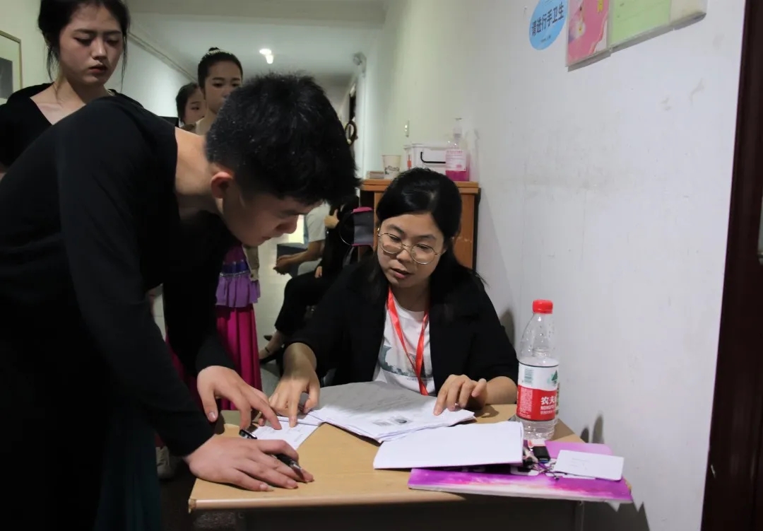 考试当天,志愿者们根据工作安排,为考生分发号码牌、收取考生们的伴奏音乐、叫号、指导考生进场要求等等,大家在各自的岗位上积极主动、尽职尽责,确保了来自全省17个县(市、区)的238名考生顺利完成专业素质加试。