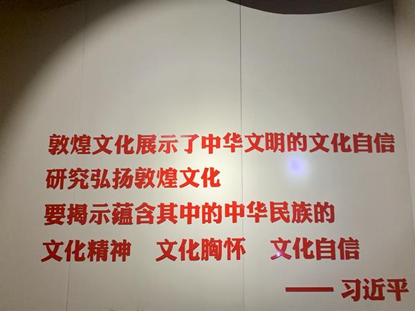 展厅展陈了莫高窟的石窟艺术,分为早期、中期、晚期三个阶段。讲解员带领师生走近敦煌壁画艺术,讲述莫高窟的大事记。敦煌石窟和敦煌藏经洞出土的文物浓缩了中古敦煌的历史,形象地记载了在开放背景下欧亚文明的互动、汉民族与其他民族的交融;反映了4—14世纪一千多年间佛教及艺术的流传及流变;保存了丰富生动的中外艺术形象及艺术的源流传承;展示了中古时期广阔的政治、军事、文化、科技等社会生活的场景,具有超越时空经久不衰的魅力,在不同时代、不同民族、不同信仰、不同地域的人们中间产生共鸣。这也正是中华民族以自己的优秀文化为世界做出的贡献之一。