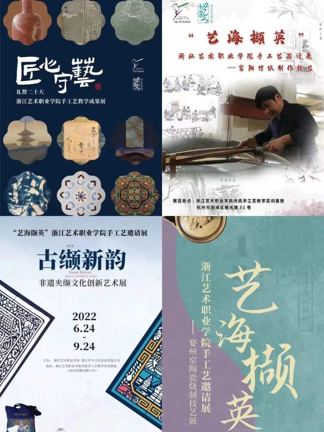 非遗学院谋新局。参与浙江非遗学院申报和挂牌仪式筹备工作,举办“匠心守艺”非遗教学成果展,完成《浙江省手工艺类非遗从业人员学历教育情况调研报告》。举办“艺海撷英”手工艺非遗邀请展之富阳竹纸制作技艺展、温州夹缬技艺展、婺州窑陶瓷制作技艺展,以非遗展览、实践教学、活态体验和学术讲座,展示非遗技艺和相关文化,实现非遗保护、传承和传播。