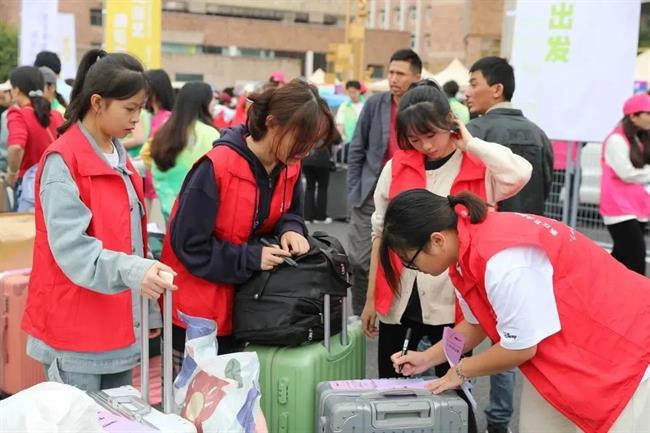 尽管天气时晴时雨,志愿者们一直坚守在岗位上,指引路线、搬运行李,尽心服务好每一位新同学,报道工作有条不紊地进行着。
