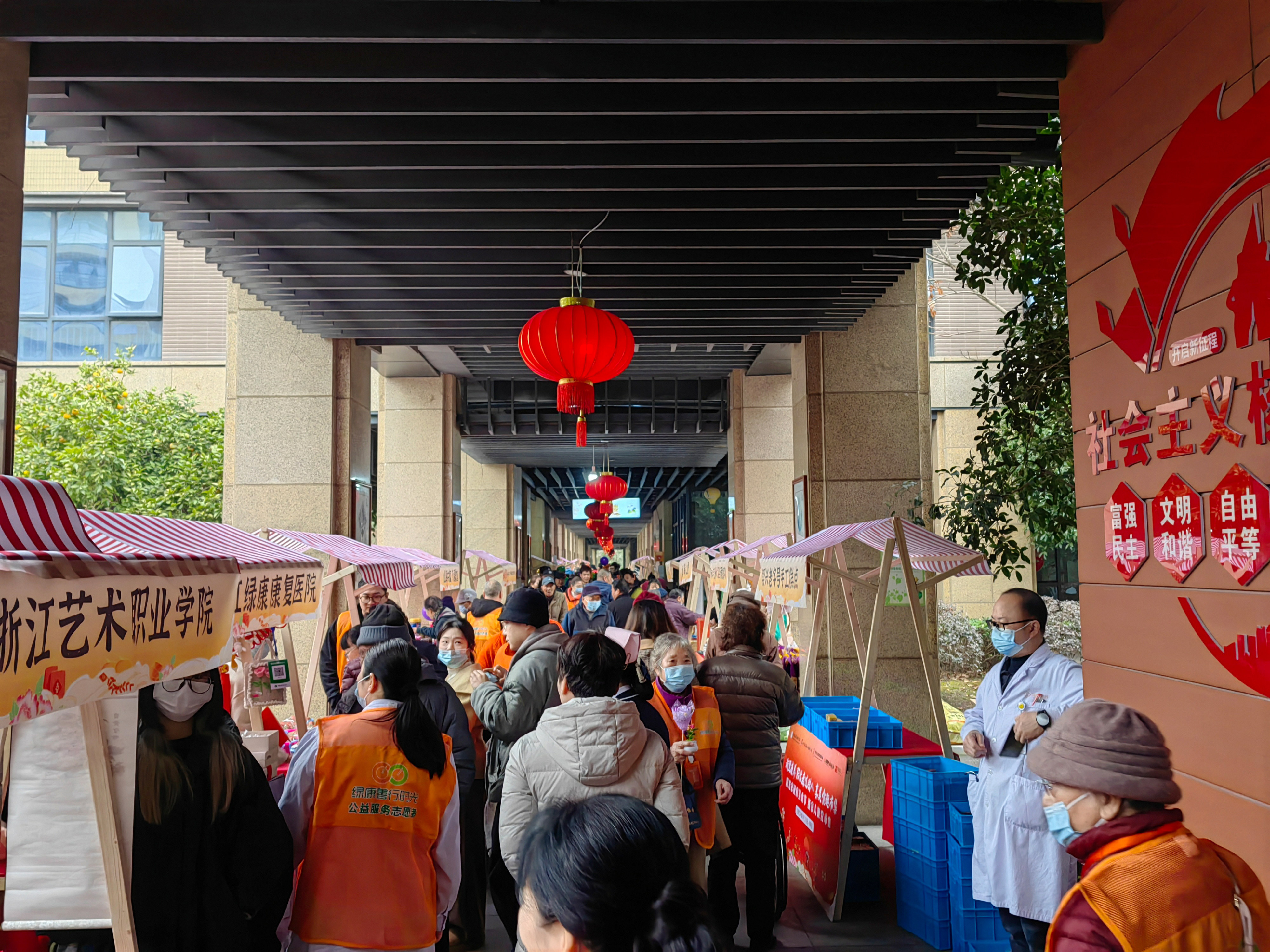 水印木刻体验摊位前,一位长者正认真地印制着自己的作品,每个动作都透露出对传统文化的欣赏和敬意;扎染作品摊位上,一块块布料迎风飘扬,绽放出独特的风采;瓷器作品摊位内,精美的杯、盏、碗引得老人们驻足欣赏;手写福字摊位前,人潮涌动、福字飘香,一笔一划都带着新年的祝福和希望。