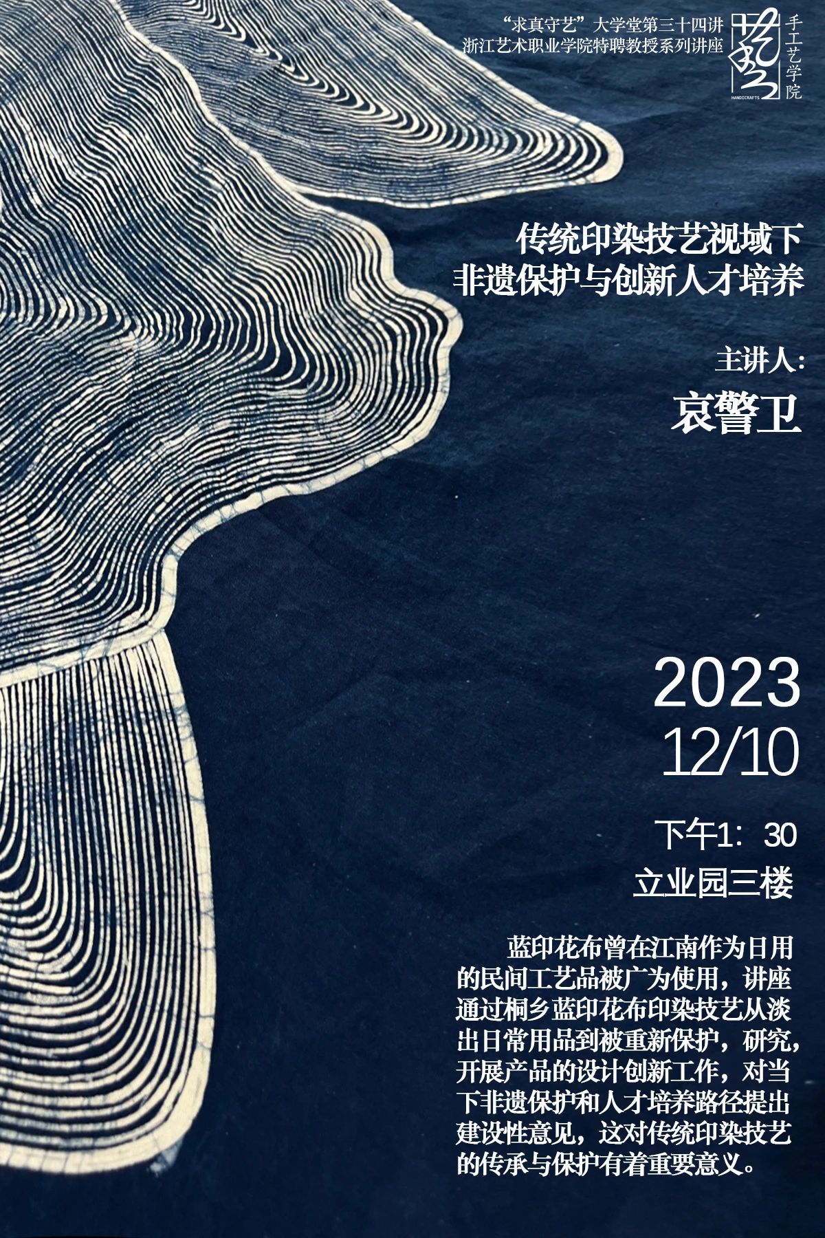 12月10日,手工艺学院开展“求真守艺”大学堂第三十四讲专题讲座活动。本次讲座邀请了哀警卫大师带来一场题为《传统印染技艺视域下非遗保护与创新人才培养》的精彩分享。