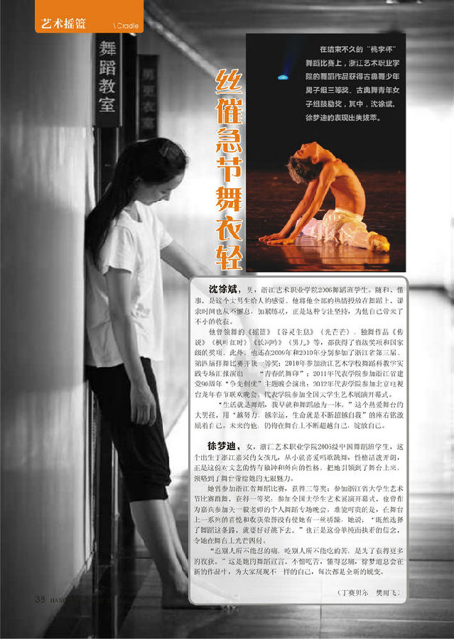 在结束不久的“桃李杯”舞蹈比赛上,浙江艺术职业学院的舞蹈作品获得古典舞少年男子组三等奖、古典舞青年女子组鼓励奖,其中,沈徐斌、徐梦迪的表现出类拔萃。