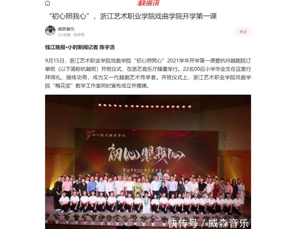 9月15日,浙江艺术职业学院戏曲学院“初心照我心”2021学年开学第一课暨杭州越剧院订单班(以下简称杭越班)开班仪式,在浙艺音乐厅隆重举行。22名00后小学毕业生在这里行拜师礼,接练功带,成为又一代越剧艺术传承者。开班仪式上,浙江艺术职业学院戏曲学院“梅花奖”教学工作室同时宣布成立并揭牌。