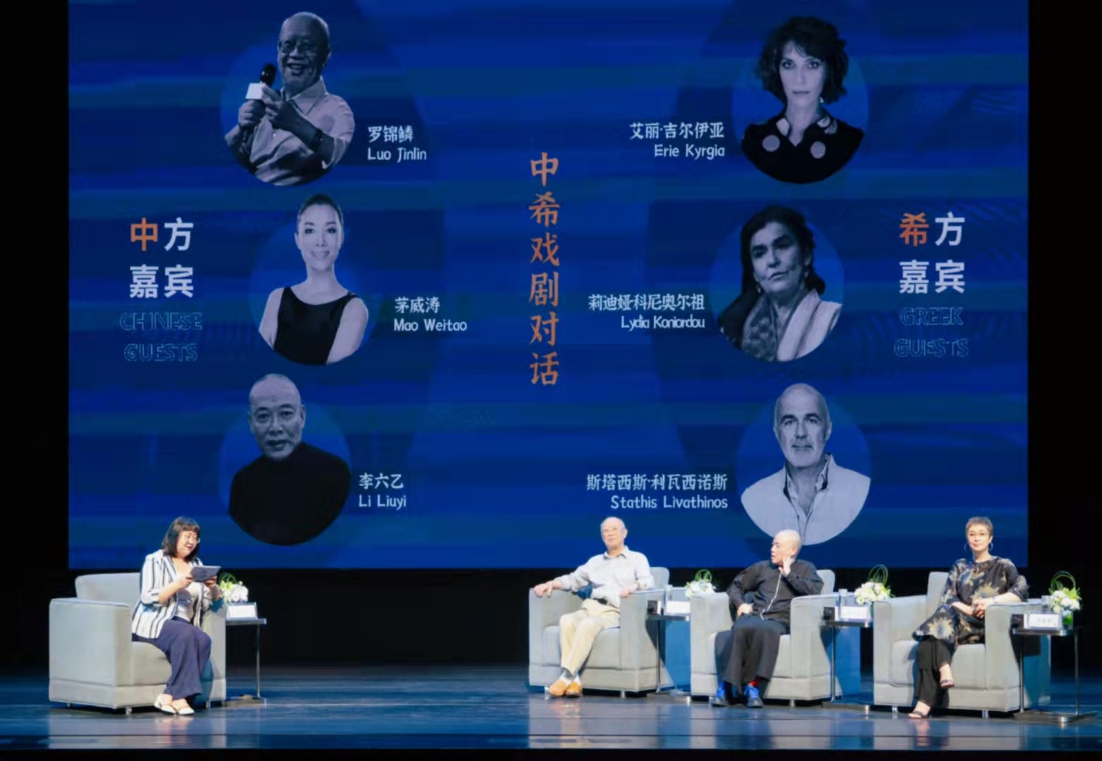 原中央戏剧学院副院长、中国希腊戏剧文化专家罗锦鳞先生,中国戏剧家协会副主席、著名越剧表演艺术家茅威涛女士,著名中国戏剧导演、剧作家李六乙先生,希腊前文化和体育部长、希腊著名国宝级艺术家莉迪娅·科尼奥尔祖女士,希腊国家剧院前艺术总监、国际著名戏剧导演斯塔西斯·利瓦西诺斯先生等嘉宾参加交流对话活动。活动主持由导演、希腊戏剧专家、上海戏剧学院驻院专家罗彤女士担任。