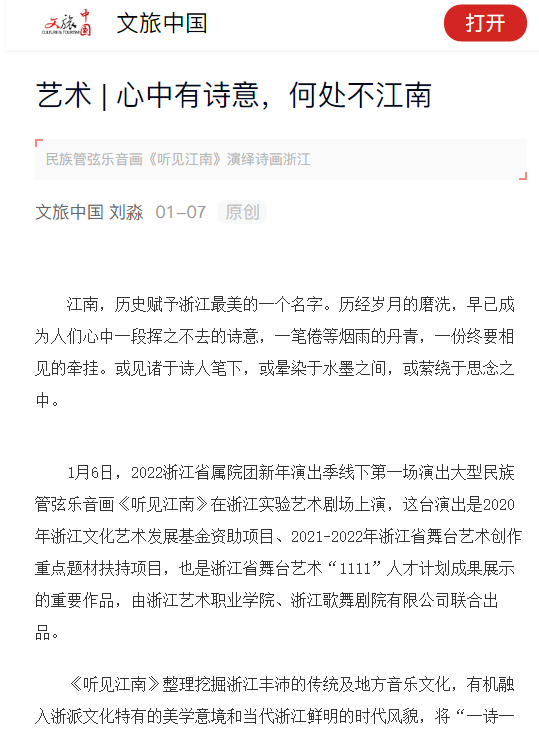 1月6日,2022浙江省属院团新年演出季线下第一场演出大型民族管弦乐音画《听见江南》在浙江实验艺术剧场上演,这台演出是2020年浙江文化艺术发展基金资助项目、2021-2022年浙江省舞台艺术创作重点题材扶持项目,也是浙江省舞台艺术“1111”人才计划成果展示的重要作品,由浙江艺术职业学院、浙江歌舞剧院有限公司联合出品。