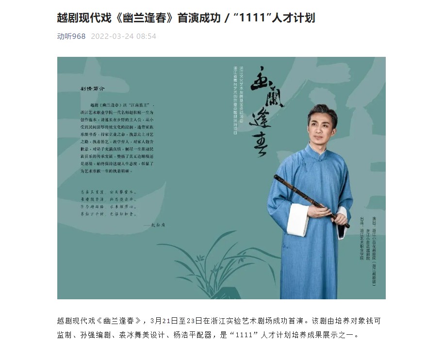 越剧现代戏《幽兰逢春》,3月21日至23日在浙江实验艺术剧场成功首演。该剧由培养对象钱可监制、孙强编剧、裘冰舞美设计、杨浩平配器,是“1111”人才计划培养成果展示之一。
