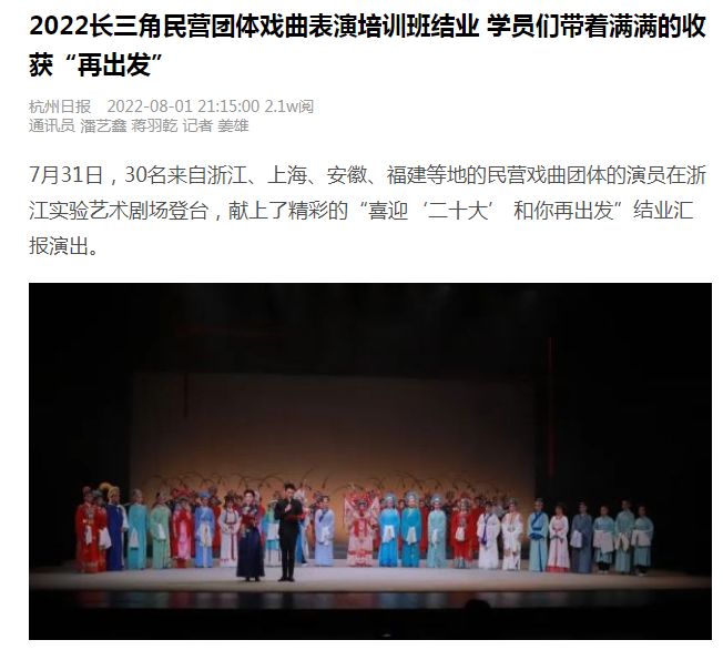 7月31日,30名来自浙江、上海、安徽、福建等地的民营戏曲团体的演员在浙江实验艺术剧场登台,献上了精彩的“喜迎‘二十大’ 和你再出发”结业汇报演出。