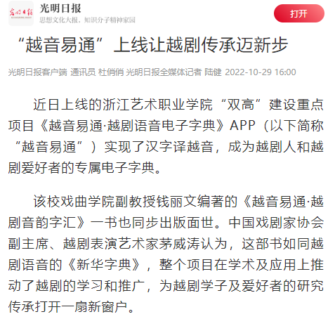 近日上线的浙江艺术职业学院“双高”建设重点项目《越音易通·越剧语音电子字典》APP(以下简称“越音易通”)实现了汉字译越音,成为越剧人和越剧爱好者的专属电子字典。