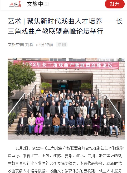 长三角戏曲产教联盟由浙江艺术职业学院发起,联合长三角区域从事戏曲教育的院校、戏曲院团、剧场及产业单位等机构组成的联合性组织,先后举办了中国希腊文化和旅游年之“照鉴·中希戏剧对话”“长三角民营剧团传统戏曲表演人才培训”“长三角戏曲产教联盟教学成果云展演”等系列活动。