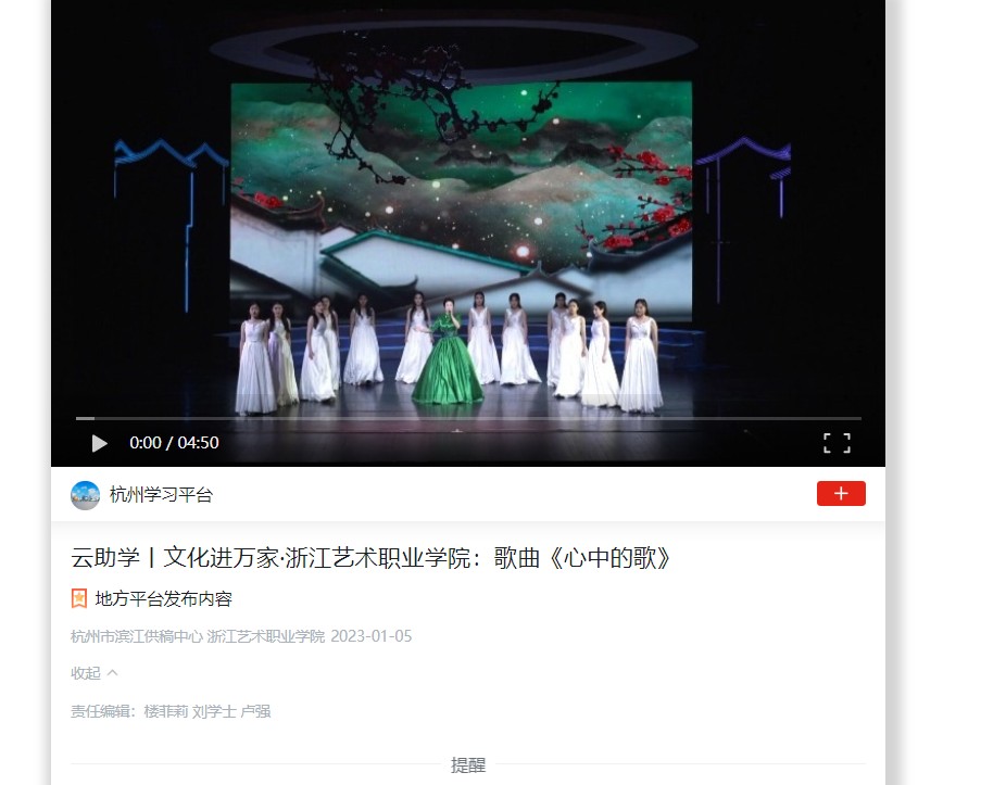 学习强国杭州平台:云助学丨文化进万家·浙江艺术职业学院:歌曲《心中的歌》