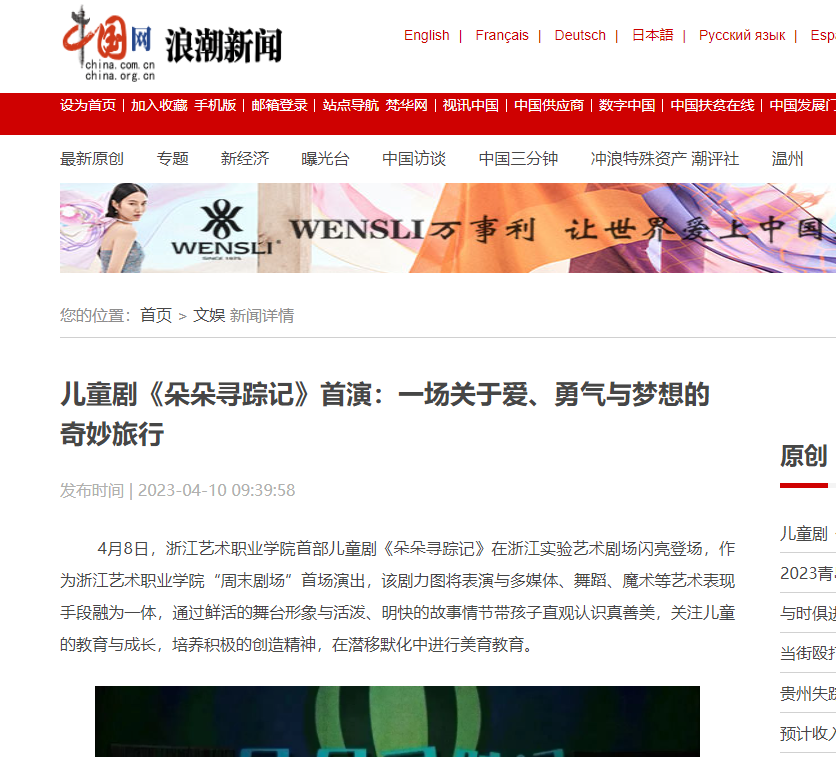 4月8日,浙江艺术职业学院首部儿童剧《朵朵寻踪记》在浙江实验艺术剧场闪亮登场,作为浙江艺术职业学院“周末剧场”首场演出,该剧力图将表演与多媒体、舞蹈、魔术等艺术表现手段融为一体,通过鲜活的舞台形象与活泼、明快的故事情节带孩子直观认识真善美,关注儿童的教育与成长,培养积极的创造精神,在潜移默化中进行美育教育。