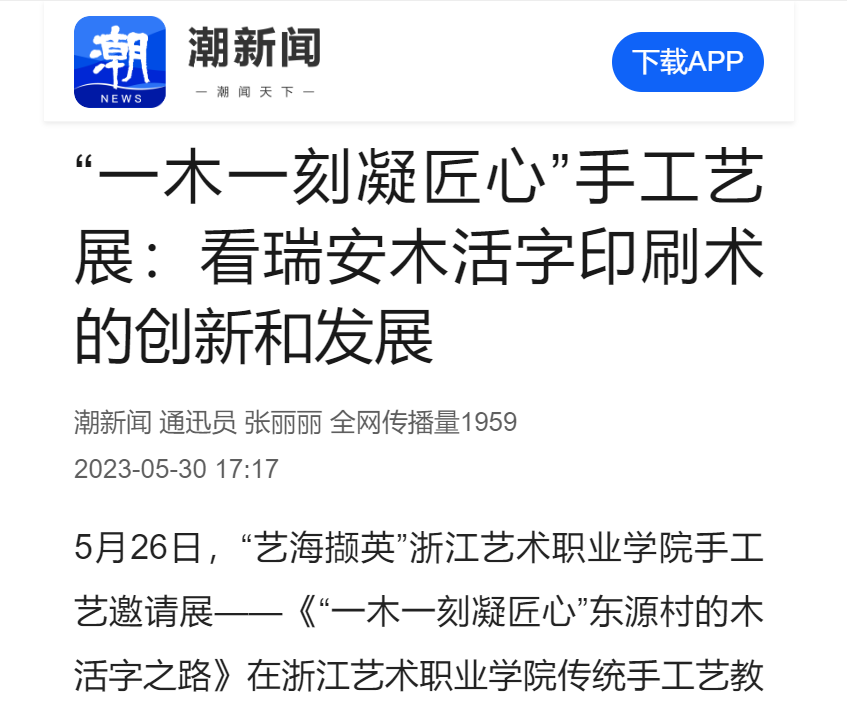 5月26日,“艺海撷英”浙江艺术职业学院手工艺邀请展——《“一木一刻凝匠心”东源村的木活字之路》在浙江艺术职业学院传统手工艺教学实训基地开幕。此次主题展为“艺海撷英”手工艺邀请展第六期,展期为2023年5月26日至6月25日。
