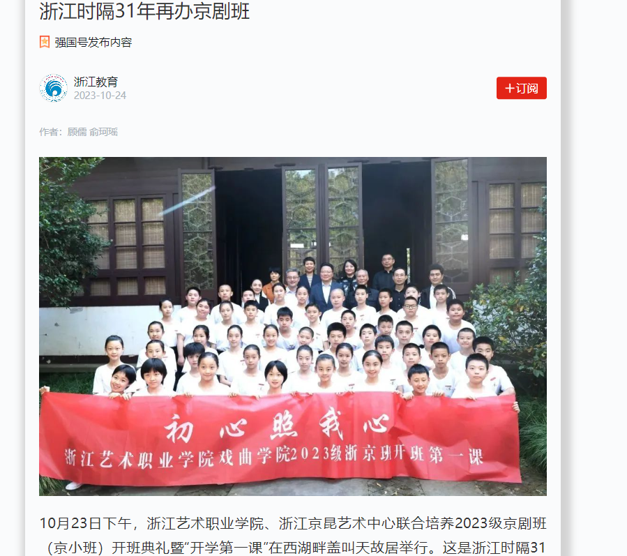 10月23日下午,浙江艺术职业学院、浙江京昆艺术中心联合培养2023级京剧班(京小班)开班典礼暨“开学第一课”在西湖畔盖叫天故居举行。这是浙江时隔31年再度开办京剧表演艺术专业订单班。