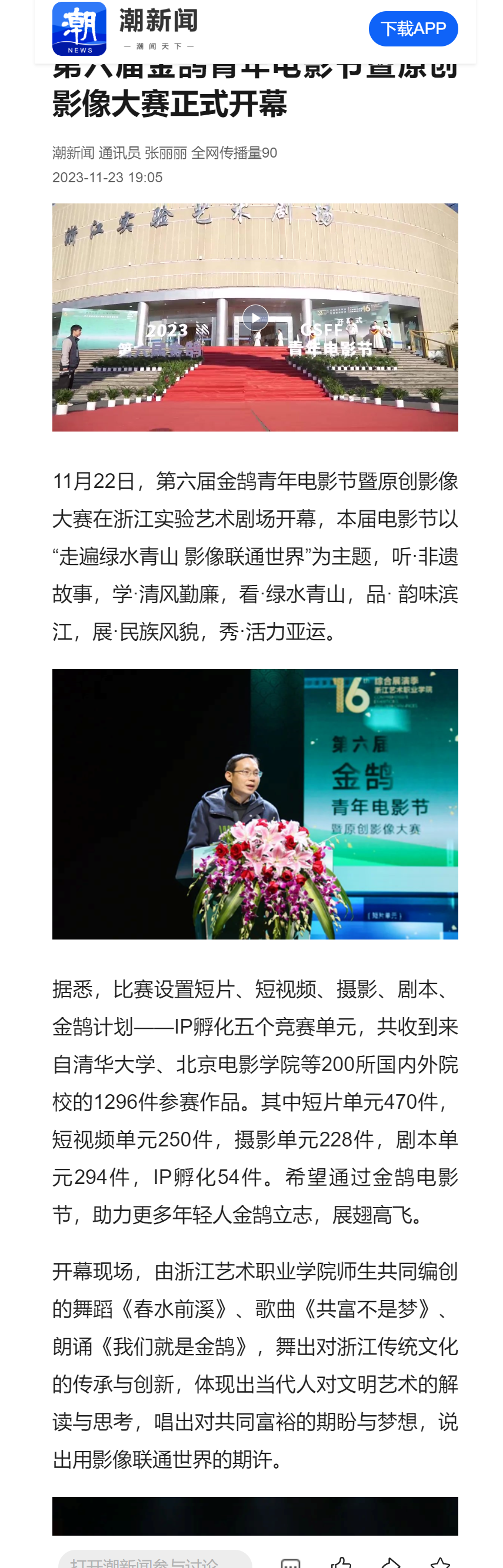 11月22日,第六届金鹄青年电影节暨原创影像大赛在浙江实验艺术剧场开幕,本届电影节以“走遍绿水青山 影像联通世界”为主题,听·非遗故事,学·清风勤廉,看·绿水青山,品· 韵味滨江,展·民族风貌,秀·活力亚运。