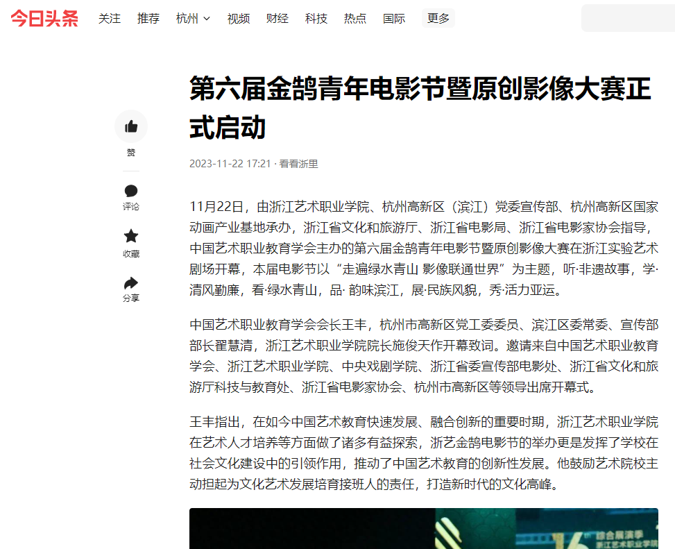 11月22日,由浙江艺术职业学院、杭州高新区(滨江)党委宣传部、杭州高新区国家动画产业基地承办,浙江省文化和旅游厅、浙江省电影局、浙江省电影家协会指导,中国艺术职业教育学会主办的第六届金鹄青年电影节暨原创影像大赛在浙江实验艺术剧场开幕,本届电影节以“走遍绿水青山 影像联通世界”为主题,听·非遗故事,学·清风勤廉,看·绿水青山,品· 韵味滨江,展·民族风貌,秀·活力亚运。