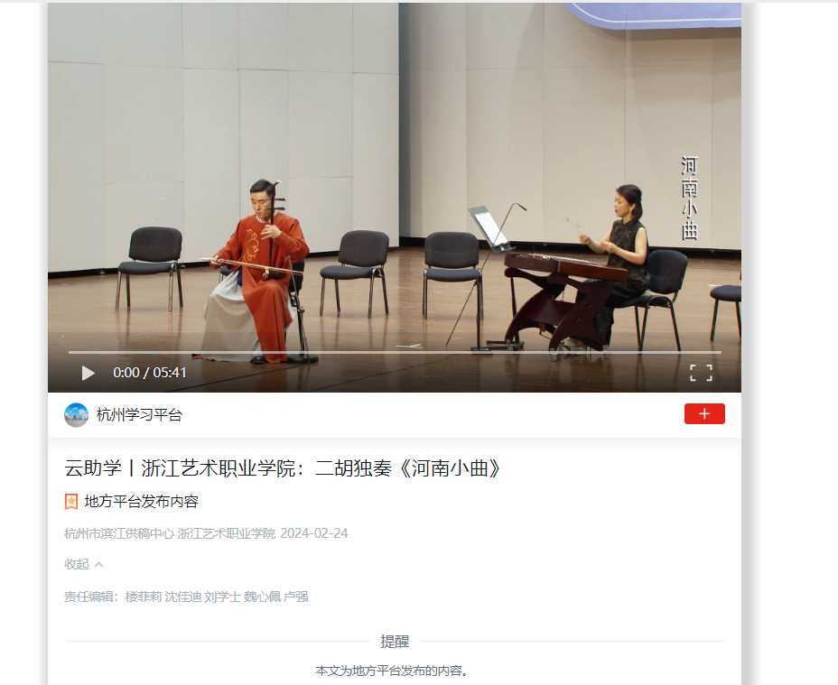 学习强国杭州平台:云助学丨浙江艺术职业学院:二胡独奏《河南小曲》