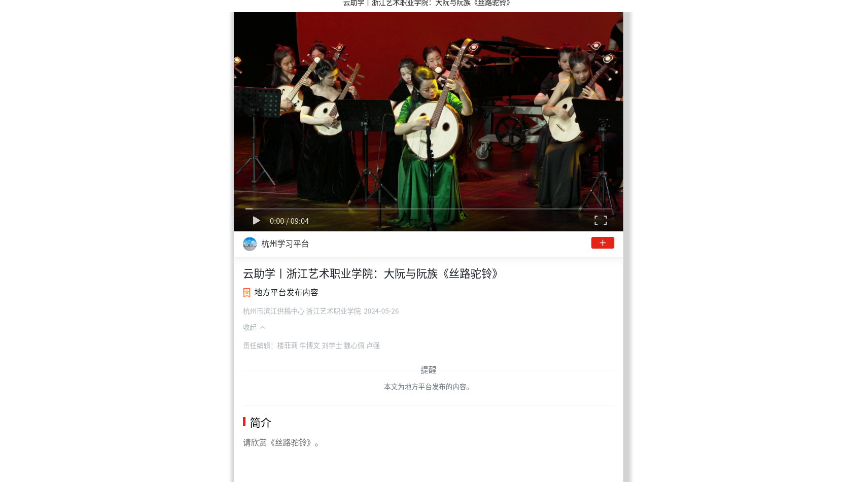 学习强国杭州平台:云助学丨浙江艺术职业学院:大阮与阮族《丝路驼铃》