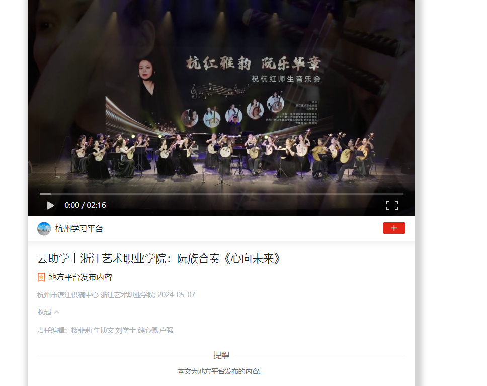 学习强国杭州平台:云助学丨浙江艺术职业学院:阮族合奏《心向未来》