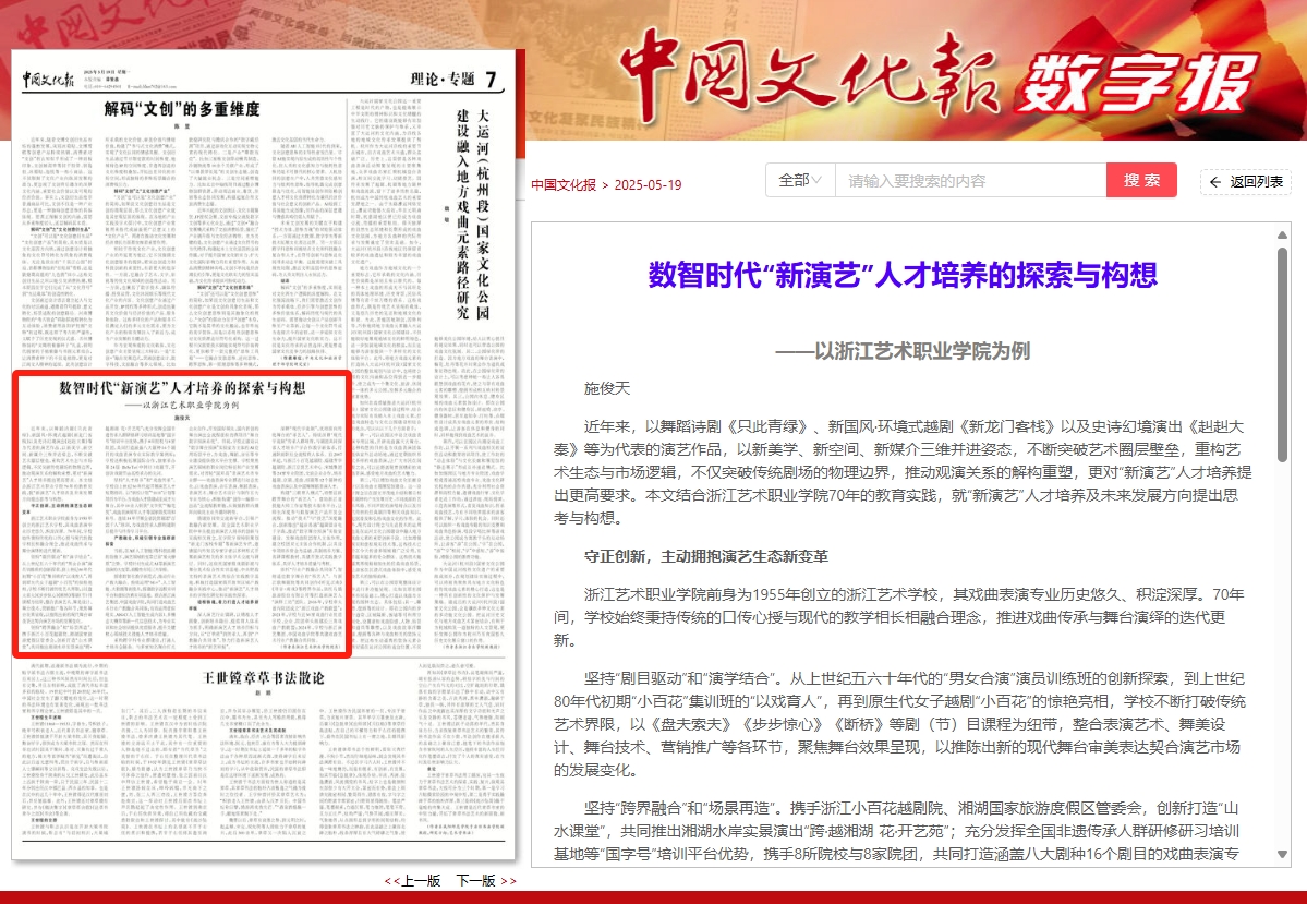 深入演艺行业调研,以精准人才画像、创新培养路径、提质育人体系为抓手,明确新演艺人才培养目标与方向,从“订单班”到传承人,再到“产教融合共同体”,努力打造新演艺人才培养的“浙艺样板”。
