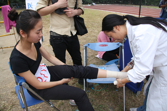 要说运动会,一定少不了他们,为受伤的运动员们进行及时治疗的校医们。身着一身白衣的他们,在今天运动会上也是异常美丽。虽然,他们只是坐在一个不起眼的角落里,但是运动场上有人受伤了,他们一定会背着医药箱最迅速到达现场给予救助,这样的工作精神值得我们所有人学习。