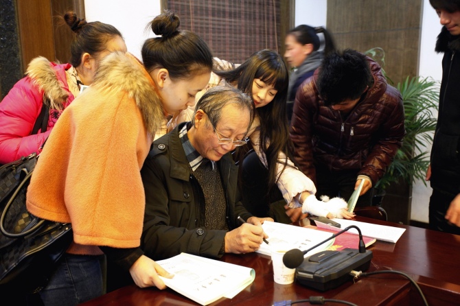 离开顾奶奶家,我们来到了全国闻名的水乡——西塘。来探寻韩金梅老师的踪影。他是获得文华大奖的音乐剧《五姑娘》的编剧之一,中国音乐协会会员,更是研究嘉善田歌最权威的专家。午饭后,在会议厅中,韩老师从历史发展、舞台演绎等方面介绍嘉善田歌中蕴藏的精髓,并现场为大家演唱了写成曲谱的新田歌,特点鲜明,而又富有舞台演绎效果。在场的师生并就嘉善田歌的继承弘扬、创新创作等问题与韩老师进行交流,除此之外,韩老师赠送了每人一本新出的书《亲亲水乡人》,让相关专业的同学,有了更多的学习素材。归途中,音乐系学生朱超威、沈高宇情不自禁地捧着韩老师的书,在施王伟老师的指导下学唱起来。行程中还有个小插曲,午餐时,戏剧系张羽萌同学随口一嗓子《我家有个小九妹》引起隔壁桌来自上海戏剧学院老师们的喝彩,阵阵掌声让在场的师生无不为之骄傲。