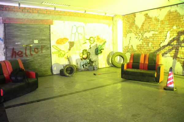 这次毕业展览依托4号楼大厅为空间,创造出一个复古中透着七八十年代叛逆朋克气息的世界。离四号楼正门50米开外的地方,老远就能望见一个火红的立方体,上面刻有四个黑色木雕大字——舞美出品。展区入口呈凹形,犹如哆啦A梦的时光隧道,带你进入一个现实穿越梦幻的舞台。这不是好莱坞大片现场,也不是街舞社团,更不是3D鬼屋,但这里的每一个细节无不体现出奇幻与现实的巧妙结合。场景内部设有3个彩色散光灯,颜色依次是:红、蓝、黄、橙、紫、白。红色给人一种火焰燃烧之感,绿色则透着一种温暖奇幻之感,而白色又带来回归现实的感觉。墙上布满了涂鸦,还有左测废弃的轮胎,旧沙发,可口可乐的汽油桶。楼梯和门的设计也成为展出的一道风景线,往右边走去你会看见一个类似于观望台一样的梯子,当灯光匀速转动并更换时,会在墙上形成不同的投影。