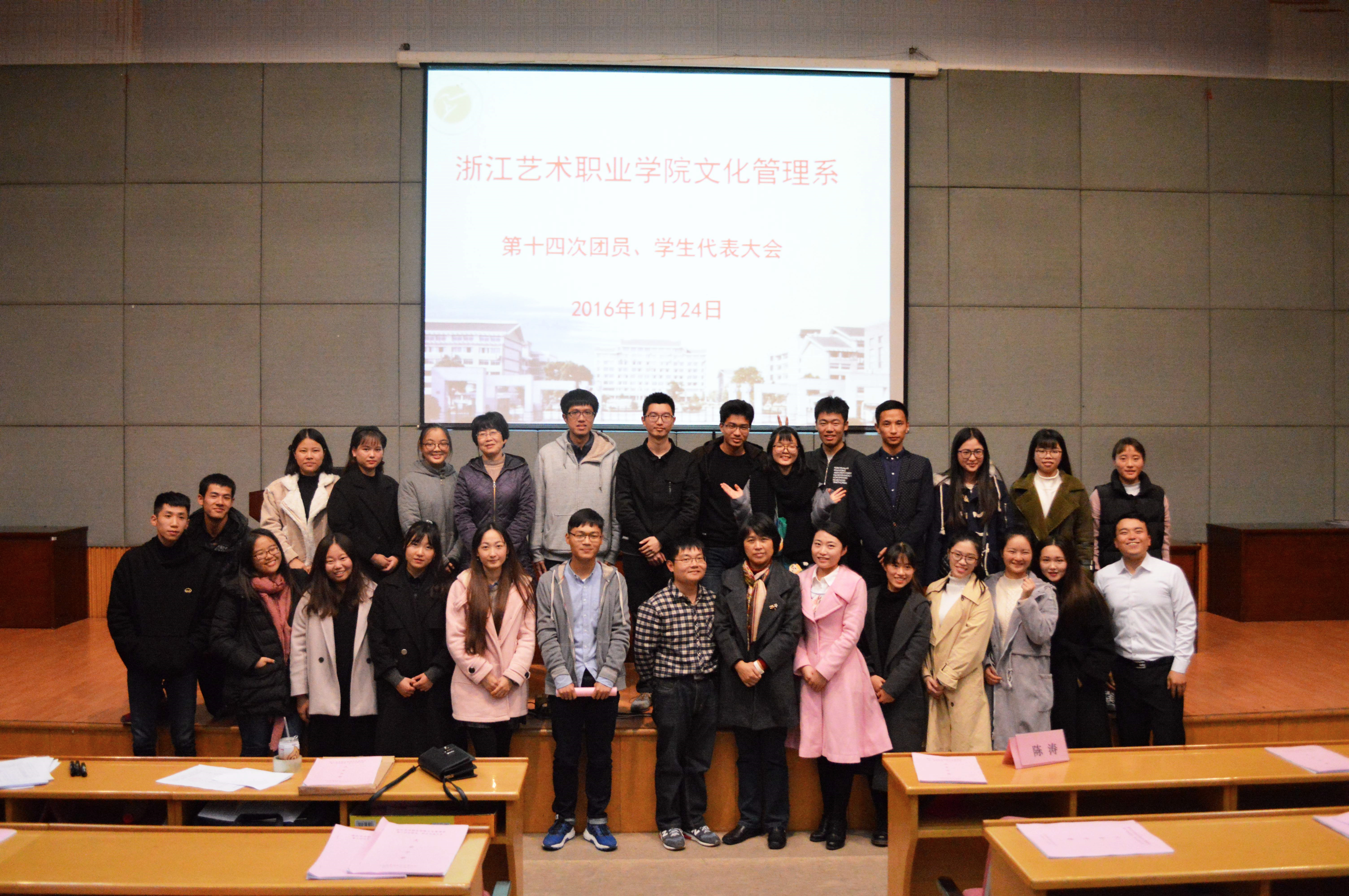 11月24日晚,浙江艺术职业学院文化管理系第十四次团员、学生代表大会在图信中心报告厅举行。院党委学工部副部长、学生处副处长(主持工作)陈毅、院团委副书记郑吟及文管系师生代表等出席本次会议。