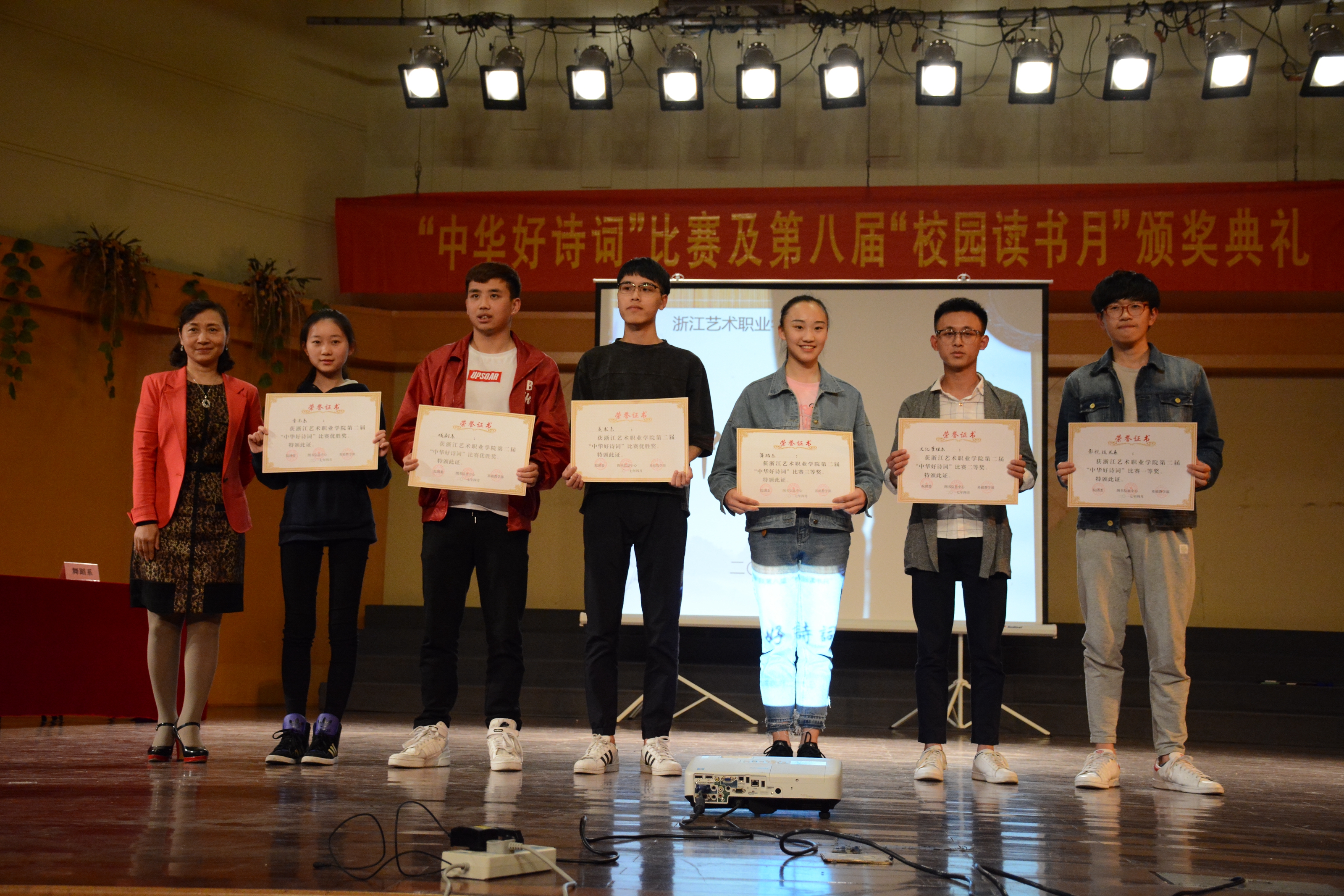 427晚,浙江艺术职业学院第二届“中华好诗词”大赛暨第八届“校园读书月”颁奖典礼在音乐厅举行。此次“中华好诗词”大赛由学院图书信息中心、院团委、基础教学部联合举办,面向全院六系学生,旨在让师生通过活动,感受诗歌的魅力、得到民族人文精神的熏陶,并在完善自身人格修养、提升文化品位的同时,能够自觉地承担起传承中华文明、弘扬民族精神、推动社会进步的历史重任。院长黄杭娟,院党委委员、副院长夏开堂以及相关职能部门负责人、六系党总支副书记出席大赛及颁奖礼。