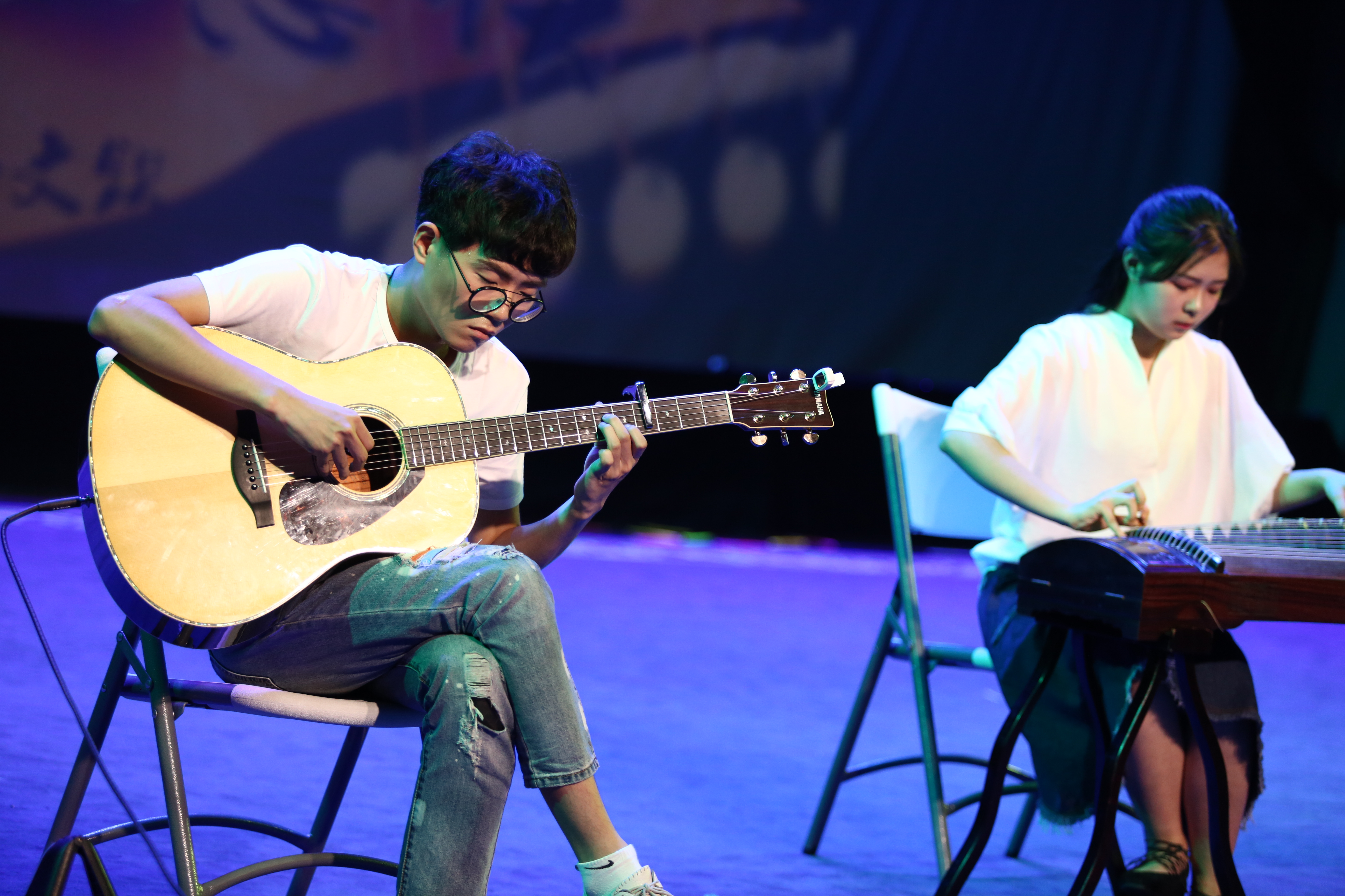 开场前,大屏幕播放了文化管理系17届毕业班班主任送给学生的毕业寄语视频,毕业生入校第一张照片、在校期间的班级聚会、团学活动、学院比赛等难忘瞬间一一呈现,勾起了大家温暖、有趣的回忆。晚会节目精彩纷呈,弹唱说跳,样样吸引人心。语言类节目有特别加入了当下“小黄车”和电信诈骗为素材的相声,有表现文物修复专业毕业后那些事儿的小品,融修身教育、防诈骗、搞笑于一体,耐人寻味。小品《毕业后的那些事儿》以及相声《忽悠?Say no》带有独特的文化管理系风味,当演员们追求但不受制于发音与动作设计等专业技巧时,带给观众的又是一波趣味。王剑鑫、杨申辉等带来了力量与激情兼具的舞蹈,大男孩将刚气与柔情很好地揉捏在一起,让人惊叹这么好看的舞蹈也能出自文化管理系非表演专业的学生。陈浩南的梦想就是将温州乐清小调《对鸟》唱满三年,仔细回忆,大大小小的场合,他的《对鸟》一直活跃在观众的眼前,这次他与搭档好友卢欣颖一起演绎这首《对鸟》,又一次引起了大家的关注。吕芷旸、凌意等带来的民谣组合《旅行的意义》是全场节目中一股深邃的清流,鼓声琴声悠扬,绵细歌音缓缓飘荡,简直是民谣爱好者的一场视觉和听觉上的盛宴。尤瑞珍的个人吉他弹唱《成都》也是极赋个人特色,安静稳重,歌声款款而来。宋煜老师携心爱的琵琶再次亮相毕业晚会,继去年激情高昂的《十面埋伏》之后,此次带来了柔情四溢的《琵琶语》,动人的旋律不绝于耳,稳重的台风,娴熟地演绎,引得同学们称赞“绝妙美”。而另一种充满奇妙思维的弹奏便是《无题+别恐惧》,吉他与古筝的相遇,是不同时空的经典碰撞。17届毕业生季鸿建的独唱《一剪梅》以及在校生余周整的独唱《春夏秋冬》安静而有力量,深情款款使人回忆连篇,这是一种怀旧,也是一种对大学生活的致敬。与此风格迥然的是黄河的独唱《当兵就是那么帅》,歌声慷慨激昂,有过当兵经历的他生动地演绎了铮铮的男儿情怀。音乐情景剧《给你们》、街舞《如果》表现了满满的校园浪漫,而毕业生的合唱《时间煮雨》与《再见》则又一次将大家带入了浓浓的毕业氛围。