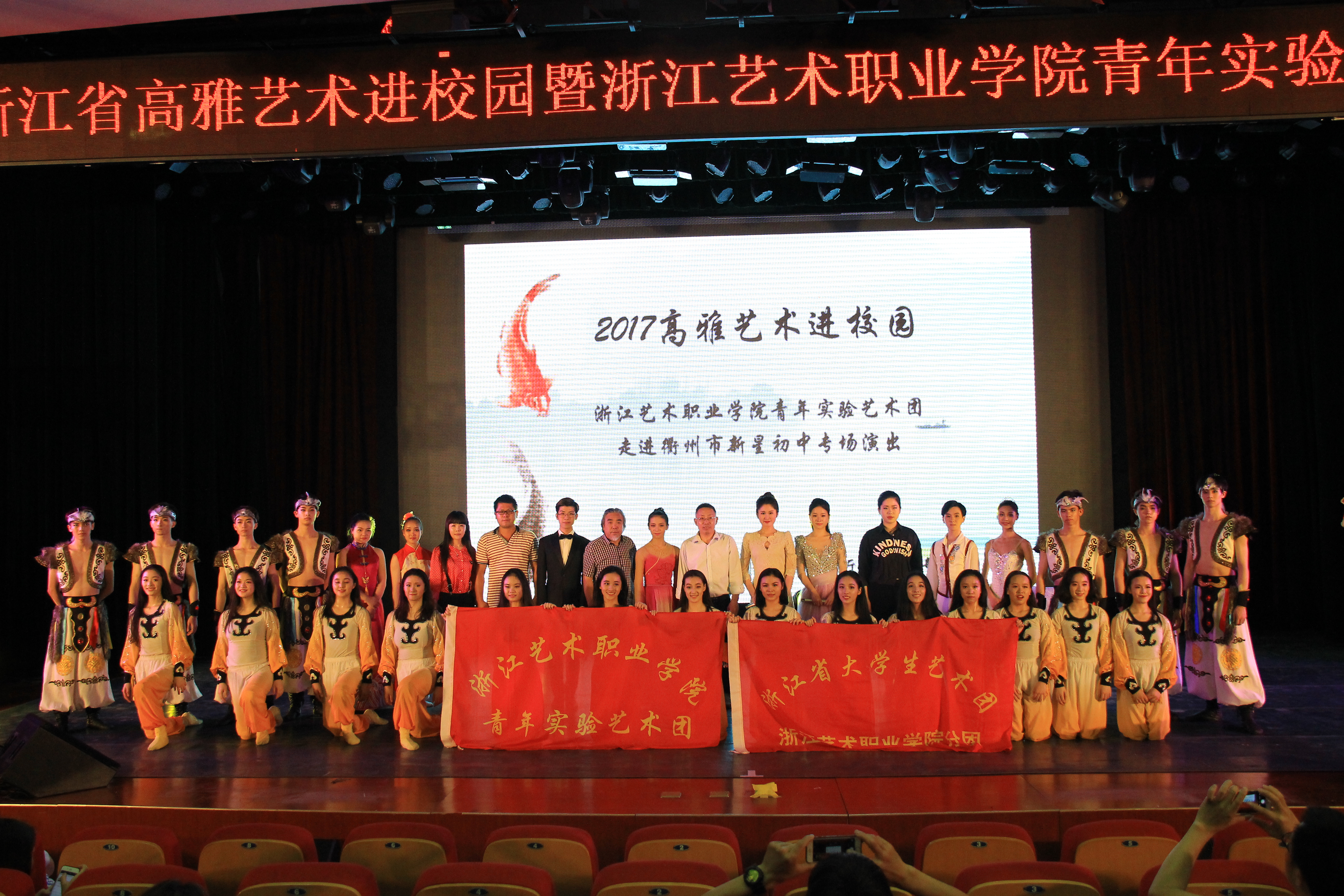 浙江艺术职业学院青年实验艺术团“高雅艺术进校园”演出活动第一阶段近日圆满结束。浙艺在舟山市南海实验学校、嘉兴学院南湖学院、嘉兴市秀州中学、衢州市柯城区新星初中、诸暨市牌头中学进行了5场专场展出。“高雅艺术进校园”活动旨在让优秀的文化艺术温润青年学生的心灵,引领青年学生树立正确的审美观念,陶冶高尚的道德情操,培育深厚的民族感情,提高审美和人文素养,优化校园艺术教育环境,引导青少年学生健康成长