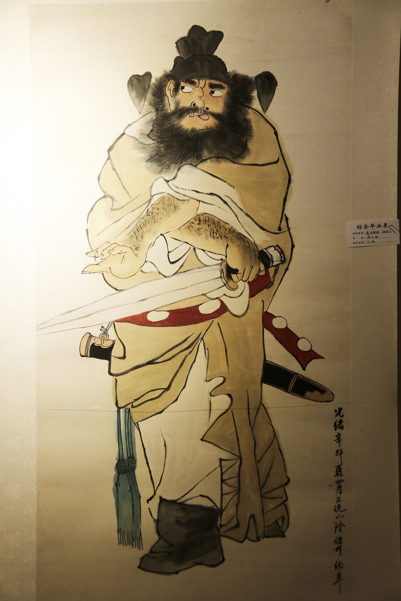 装裱作品分为字画修复与新画装裱。指导老师江杰老师说:“修复过程比较复杂,任何一步都不能错。”修复(画)共有五张作品,其中修复的画心都是从古玩市场淘过来的。字画修复总体可分为四个步骤:洗、揭、补、全,洗为清洗,揭为揭覆背纸和命纸,补为修补残破的地方 ,全为全色(补色)。这一组的展览作品制作了近一个学期,每一张修复画都要花一个月左右的时间来做。装裱部分皆按传统手工书画装裱,裱件干净清爽,笔挺柔软,清新雅致。陶艺由泥土拉坯成型,晾至七分干,接着修坯,上釉,最后烧造而成。短短一句话概括了过程,但实际却并不简单,前后花时几周甚至更长。在傅菲菲老师与郑源雷老师的指导下,陶艺组做了许多精美的作品,有各种各样的杯子,以脚胎、青瓷为主;还有小巧的泥片,样子方方正正的,似个薄薄的方盘,以刻划花为主要纹饰,再施上晶莹的釉水,烧造出来的样子十分精致。作品中还有各式贯耳瓶,器形都是形态不一的。这些作品中比较有代表性的是俞骏昊同学的“鹰首壶”,仿东晋越窑的器型,鹰首、鹰爪、鹰尾都做的相当逼真,精湛的技艺获得了围观者的好评。