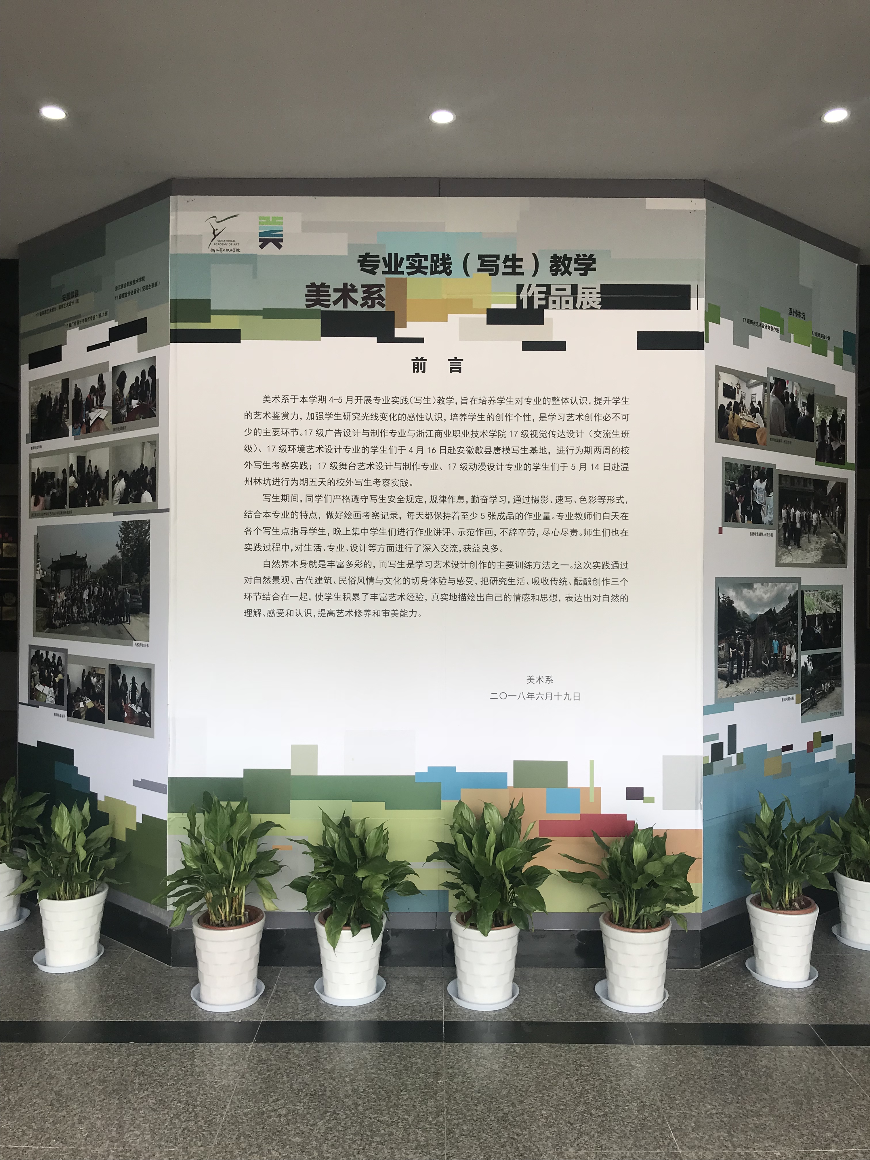 6月19日至27日,为美术系17级舞台艺术设计与制作、17级动漫设计、17级环境艺术设计(装饰艺术设计)、17级广告设计与制作与浙江商业职业学院17级视觉传达交流生班级在温州林坑、安徽歙县专业实践(写生)作品展览在四号楼展厅展出,展出作品包含风景速写、风景色彩、装饰图形、设计速写等600余件。