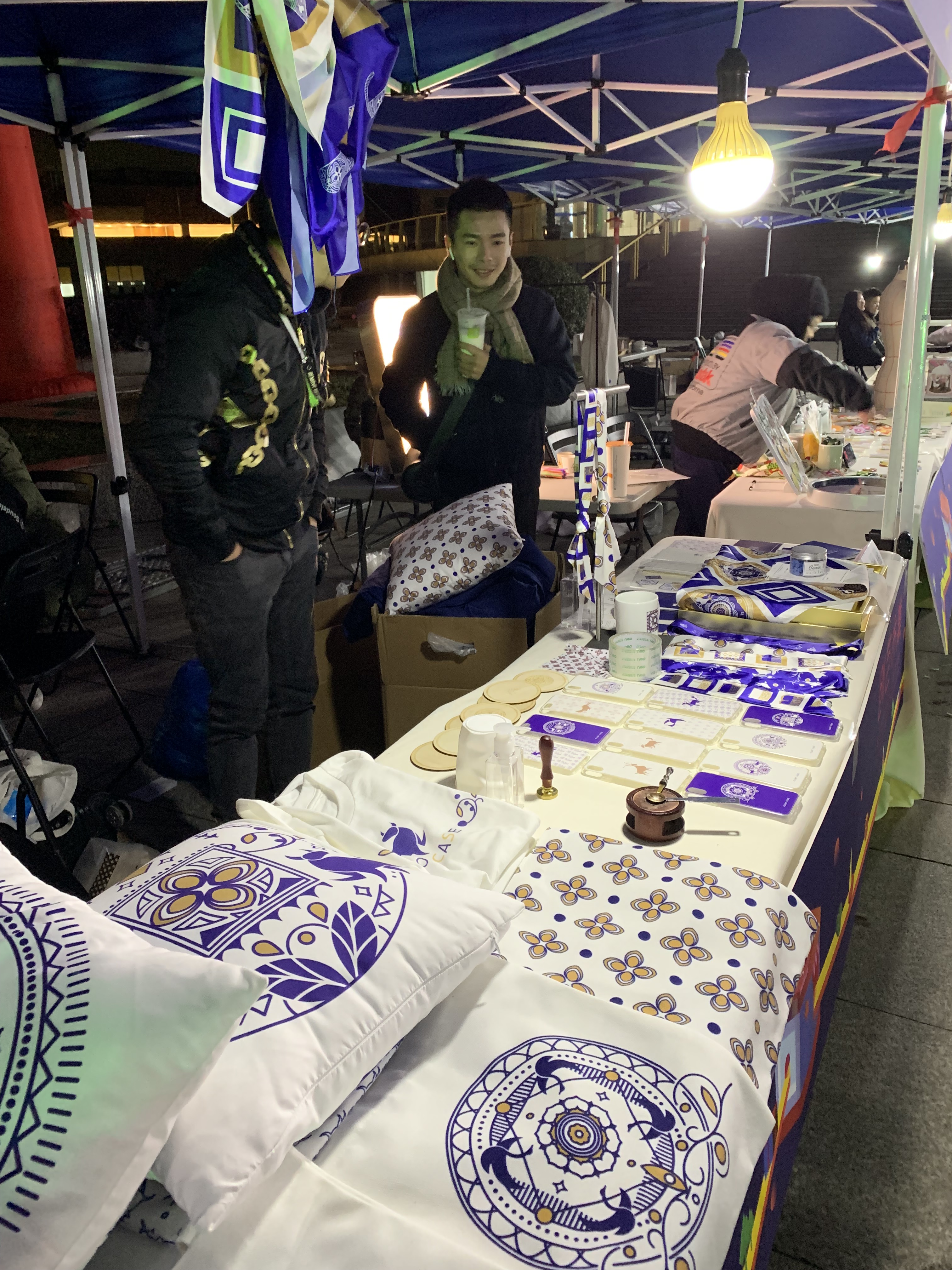 走进红色的“彩虹门”,便能看见那摆放在摊位旁的“小胖子”。这一处是广告创意产品,主题是“变形记”,展卖的有红色小胖子形象的贴纸、文件袋、健身日记、水杯等,创作者们介绍,这个设计是想要大家树立科学减肥,科学健身的理念。现场还能参与中奖机率较高的抽奖活动。“天绮咏古” “覆海”两组产品的灵感来源于敦煌壁画,设计者们希望年轻人能更多地喜欢中华传统文化,产品有抱枕、帆布包、红包等等。带着水果图案的手机壳、钥匙扣、眼罩、闹钟、水杯等“弄器”系列创意产品,旨在将健康知识传递下去,呼吁大家珍爱生命,养护器官,从年轻开始。“良渚玉器”摊位展卖的小首饰、手机壳、丝巾、抱枕等各类小产品精致美观,也有不少人购买。动漫设计的主要产品衍生于一部动画,有饰品、卡通人物、小场景、手提包、小布袋、动漫人物等。环境设计摊位是大家亲手织的围巾、帽子,编织的手提包、手环,样式精美,别出心裁。天气有些冷,可既是创作者又是零售商的同学们热情不减,向来往的人们推介着自己的产品。入了夜,创艺市集点亮了灯,有满载而归的买家,有热情似火的卖家,热热闹闹。学校领导、老师们也纷纷到市集里“淘宝”,支持同学们。