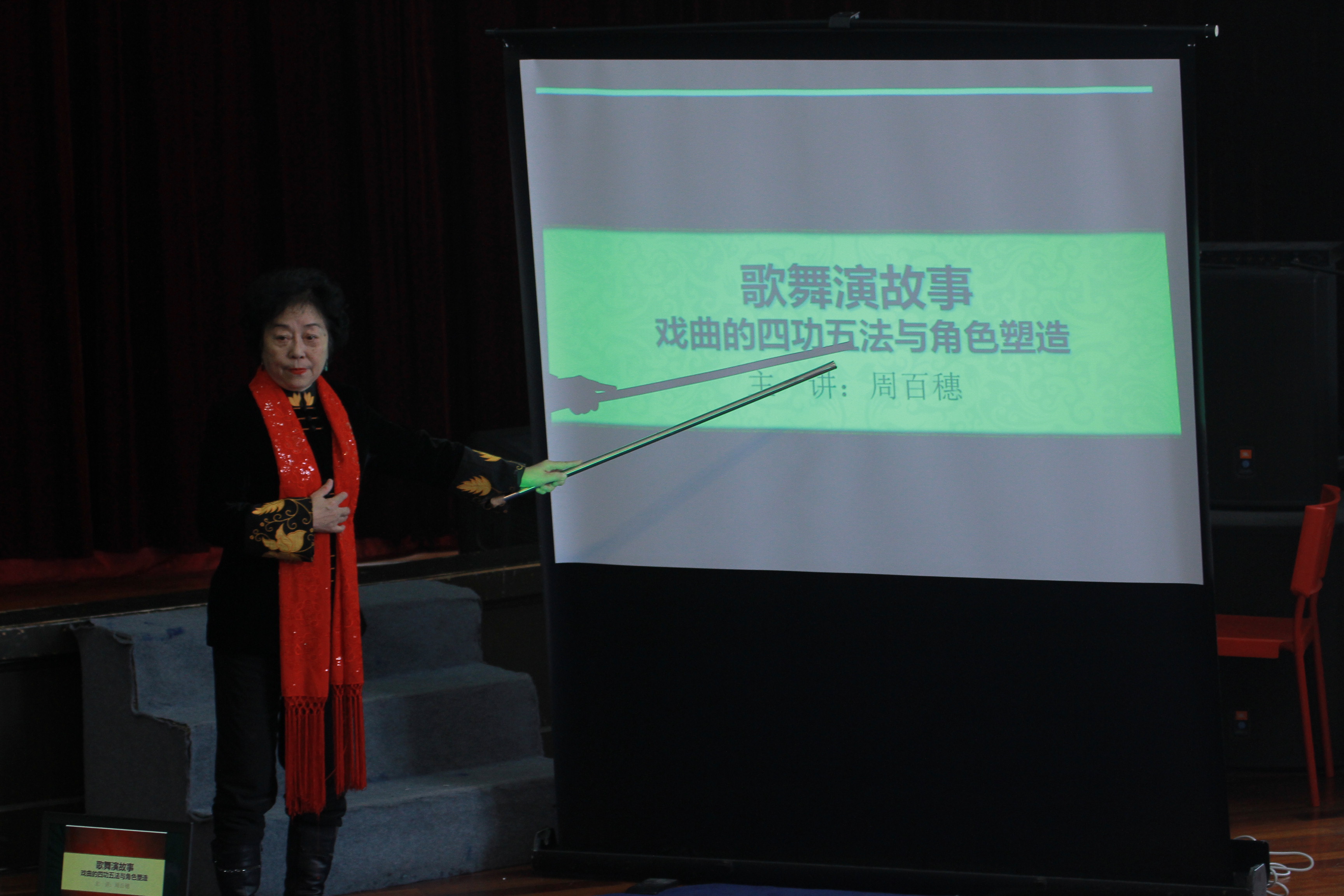 王昭君“烈马仕女图”她强调一般来说武旦的动作都是干脆利索,但在这个亮相时要柔美连贯,因为王昭君她是一位花旦,并不是传统意义上的武旦,所以在这个亮相上更要理解人物来设计动作。在讲到《贵妃醉酒》时,她说杨贵妃是集万千宠爱于一身的贵妃,在眼神和动作的处理上要有娇气的神态,但也不能失了端庄。《拾玉镯》中的小花旦身份又有了变化,她是个十四五岁买鸡的小女孩所以更加俏皮可爱,眼神也更加灵活。说到《失子惊疯》,她坦言也曾不知道该如何表达,但观察了身边的一些事例最终恰到好处地刻画出人物形象。周百穗表示艺术源于生活又高于生活,要用戏曲的方式表达。在演绎《穆桂英》的四个阶段,不同的人物不同的身份,用不同的表现形式。同一个人物,不同的年龄段,所用的身段也不同。