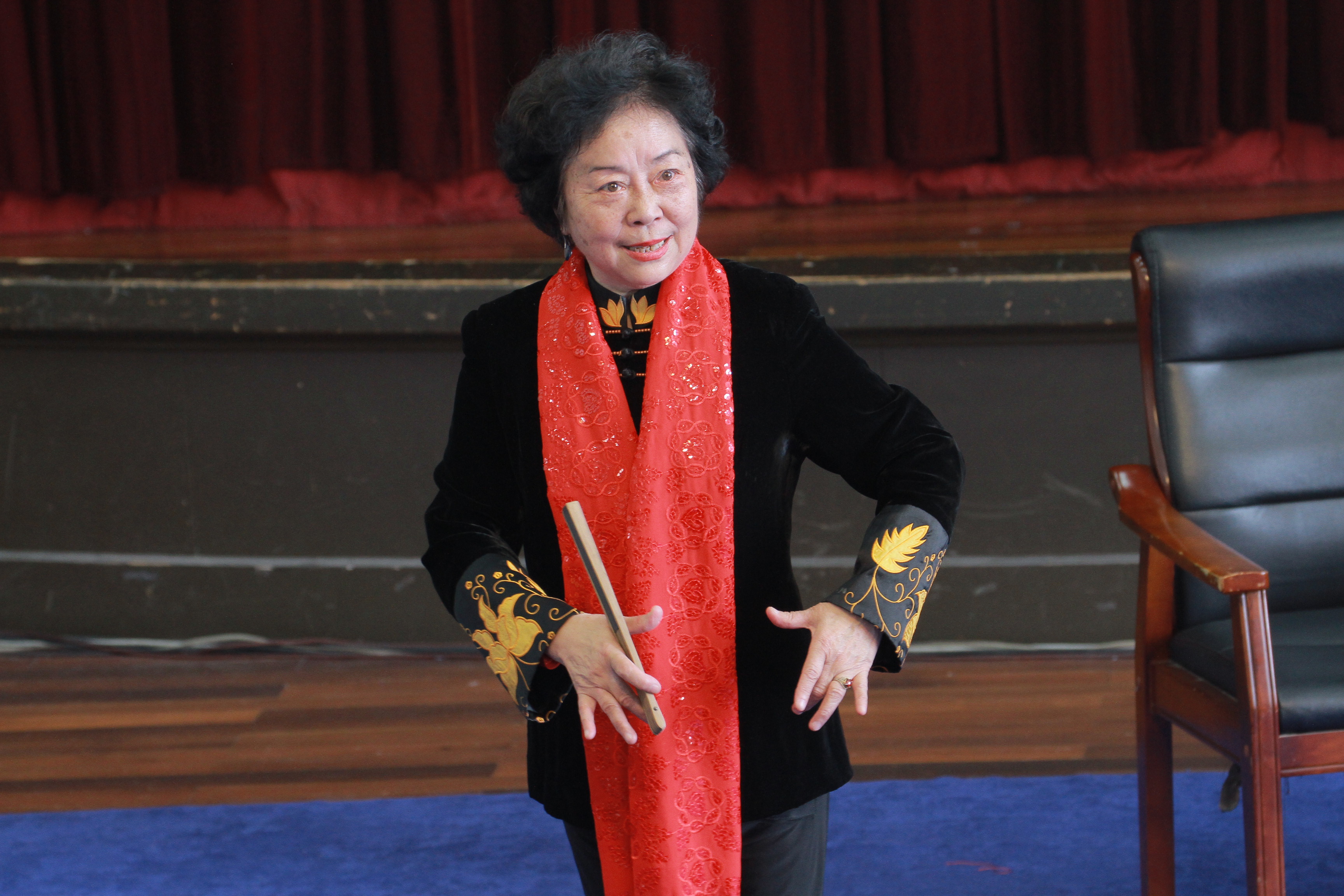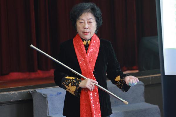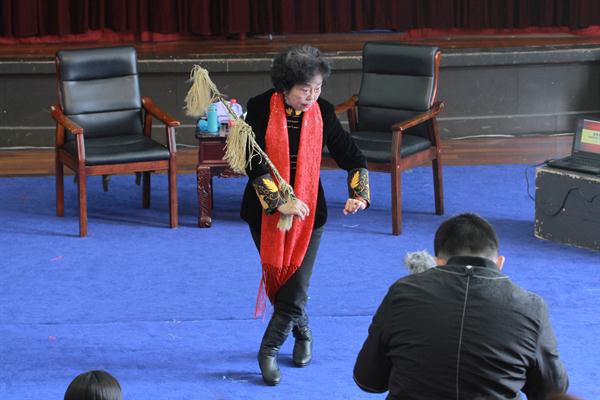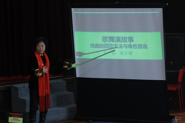 在讲座的过程中,74岁高龄的周百穗老师为同学们逐一示范了《昭君出塞》《贵妃醉酒》《拾玉镯》《失子惊疯》《穆桂英》片段,从武旦到青衣到小花旦,通过亲身示范每一个角色为同学们讲解如何演绎出不同戏曲角色行当的韵味和特点。