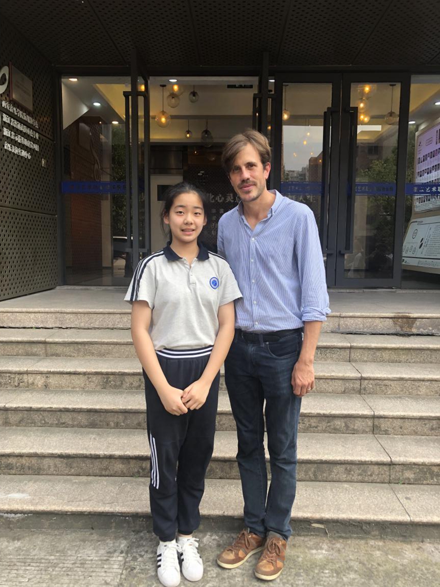 尼古拉斯·康德对附中初二年级学生许叶丹、高三年级学生吴晗现场授课指导。许叶丹演奏肖邦的《幻想即兴曲》,吴晗演奏贝多芬第七钢琴奏鸣曲第一乐章,康德对两位同学的演奏给予了高度的评价,他从作品的音乐风格、调性变化、和声结构等方面给在场师生做了深入浅出的解读。