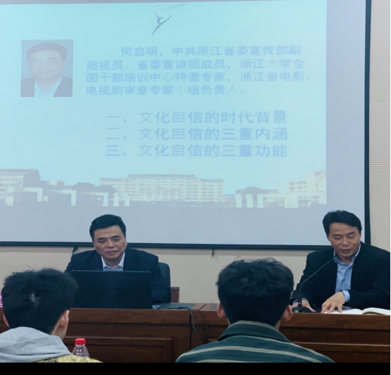 何启明围绕文化自信展开分析和论述。他从学习习近平总书记关于文化自信的重要讲话精神、坚定文化自信的时代背景、文化自信的三重内涵三个方面展开。他表示,师生们要坚定对优秀传统文化的自信、对当前中国发展道路的自信、对中国未来发展前景的自信,文化自信关系到国运兴衰、文化的安全、民族精神的独立性。针对表演(越剧音乐伴奏)专业学生,何启明提出要把专业知识、技能的学习和本科生系统学习相结合,让艺术修养在文化素质全面提升的基础上进一步提高。他希望师生们能全面提高思想政治素质、努力提高专业技能和水平、不断提高自身的文化素养,为“文化浙江”建设贡献更大力量。讲座紧扣时代脉搏、突出政治性、思想性,运用典型的事例和充分的数据论述了坚定文化自信的重要性,对师生们的思想有很大的启发和触动。