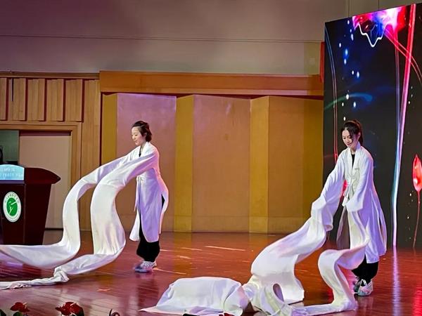 现场展示阶段,戏曲学院2016级越剧班陆祎杨和2017级越剧班黄霜霜同学以《赓续传承——我是浙艺戏曲追梦人》和《梨园筑梦 艺心向党》为题,进行了现场演讲和双人组合长水袖技能展示,最终以优异表现在众多选手中脱颖而出,荣获本届浙江艺术职业学院“十佳大学生”称号。