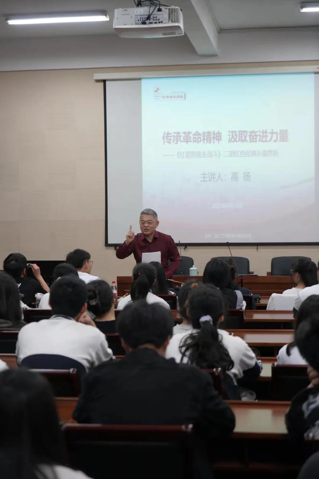 为庆祝建党100周年,深入开展党史学习教育,做到党建业务有机融合,音乐系特邀著名二胡演奏家、一级演奏员、中国音乐学院客座教授高扬来系开展“红色音乐讲堂”。讲堂于5月13日,在13101教室举行,题为“传承革命精神 汲取奋进力量——《红星照我去战斗》二胡红色经典乐曲赏析”,音乐系领导班子、全体二胡专任教师、部分党员教师、全体二胡学生参加。