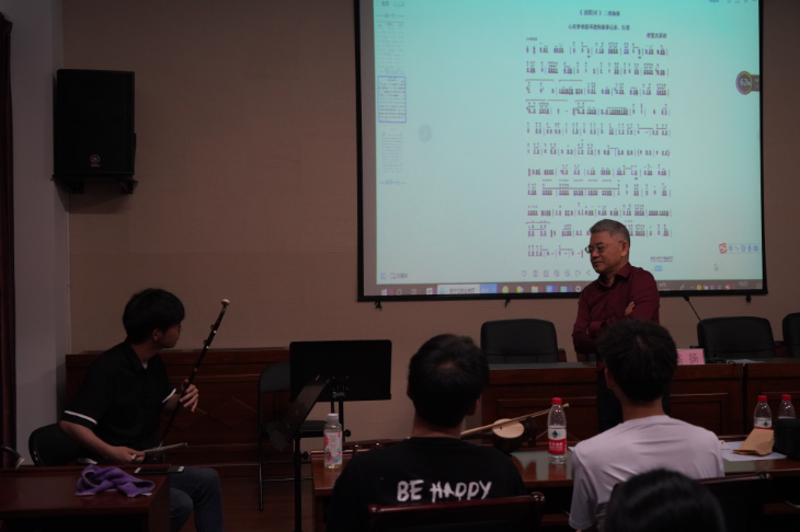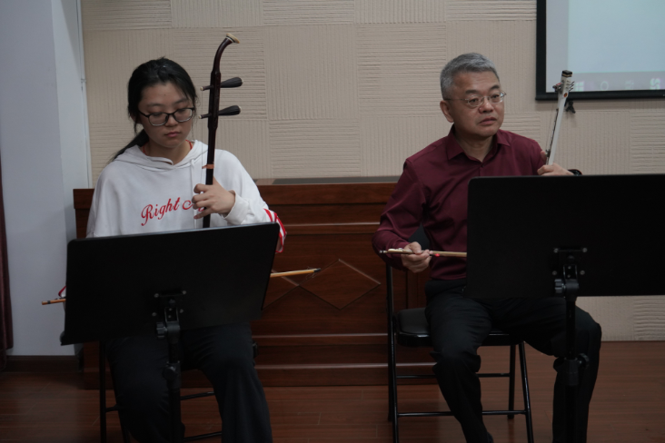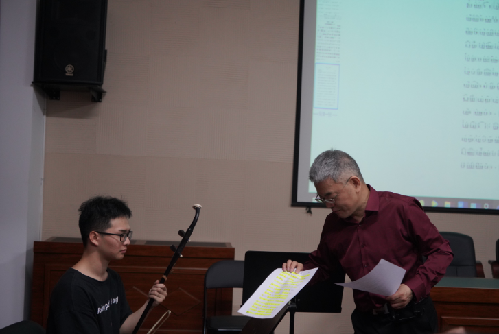 高扬表示,只有把握好二胡的“换弓、换弦、换把”三种技术,才能很好地将音色统一。注重音乐的四要素:音准、节奏、强弱、音色的训练,才能诠释好红色主题歌曲。同时,也提到了“一万小时天才原理”,提醒同学们只有刻苦练习,才能换来舞台上的精彩呈现。