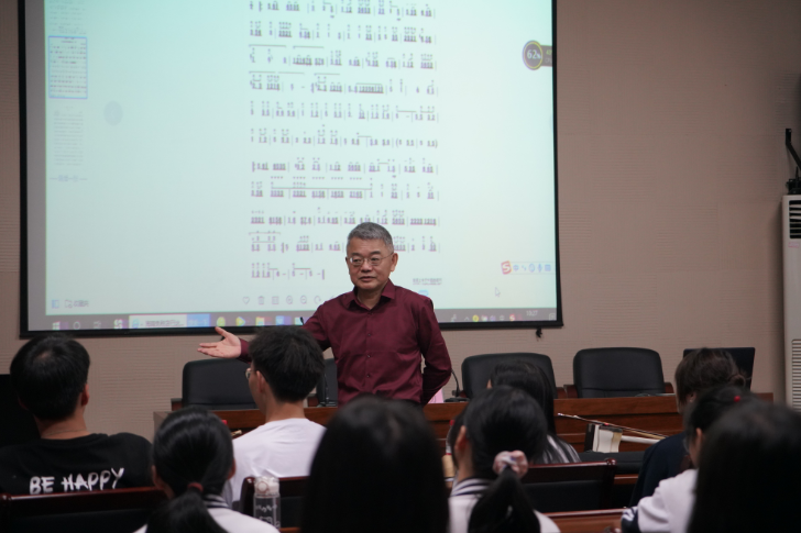 讲座伊始,高扬以“为什么说音乐是时间的艺术?”作为导入,引发学生思考。音乐作品在舞台呈现上追求的是完整无误,具有不可重来的特性。因此,音乐是时间的艺术,从演奏第一个音开始,音乐就随着时间不断地流淌,转瞬即逝。他提醒同学们,在日常学习中,要做到严谨而刻苦地练习,以量变达到质变,提高演奏水平,从而在舞台上才能有完美的表现。这种精神,正是《红星照我去战斗》所要表达的共产主义信念,中国共产党如果没有这样的执着和坚持,就不会有今天的成功。学生有信念,未来有方向。