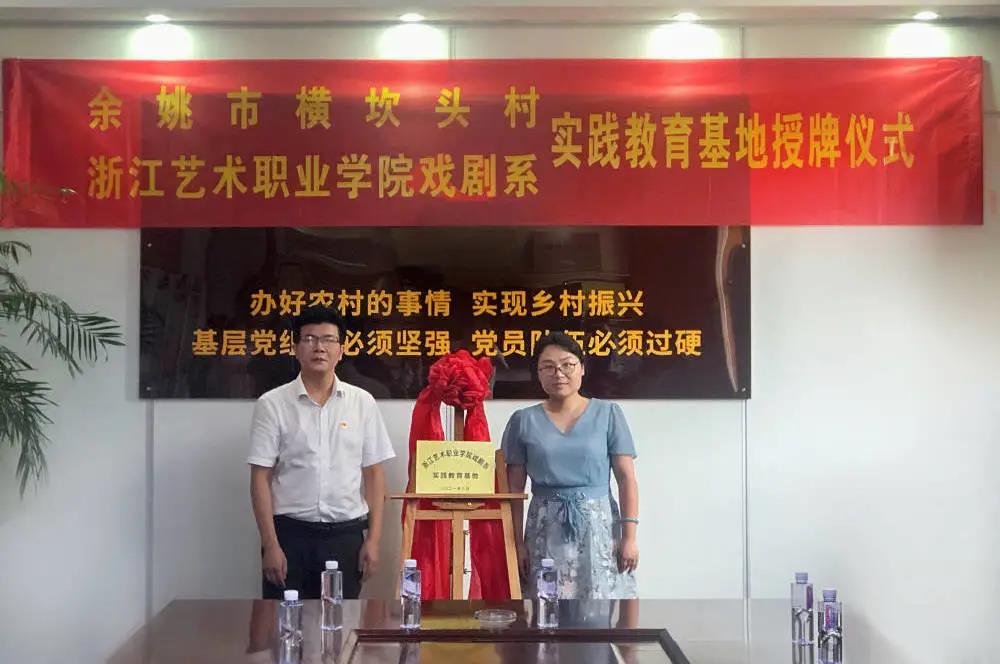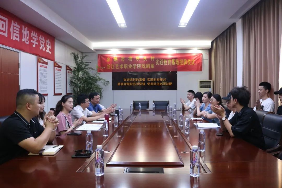 8月6日,戏剧系实践团队师生来到横坎头村村委会,举行实践教育基地授牌仪式。余姚市梁弄镇人大主席、横坎头村党委书记黄科威,余姚市姚剧保护传承中心主任、戏剧家协会主席倪乐辉,余姚市工商联副主席、原余姚市文化馆馆长、舞蹈家协会主席金晶,戏剧系党总支专职副书记许瑛,戏剧系专业教师齐帅和辅导员王玉簪等参加授牌仪式。会上,黄科威介绍了横坎头村的基本情况,他表示,实践教育基地是横坎头村与浙江艺术职业学院戏剧系交流的重要纽带,希望双方在表演形式、宣传推介等方面开展深入合作,将横坎头的红色文化以艺术形式打造成红村剧场品牌,立足宁波,辐射浙江。许瑛介绍了学院及戏剧系的特色与优势,并表示,实践基地的落地标志着双方的合作迈上一个新台阶,学校将与横坎头村共同传承和发扬红色文化艺术,为乡村振兴赋能。