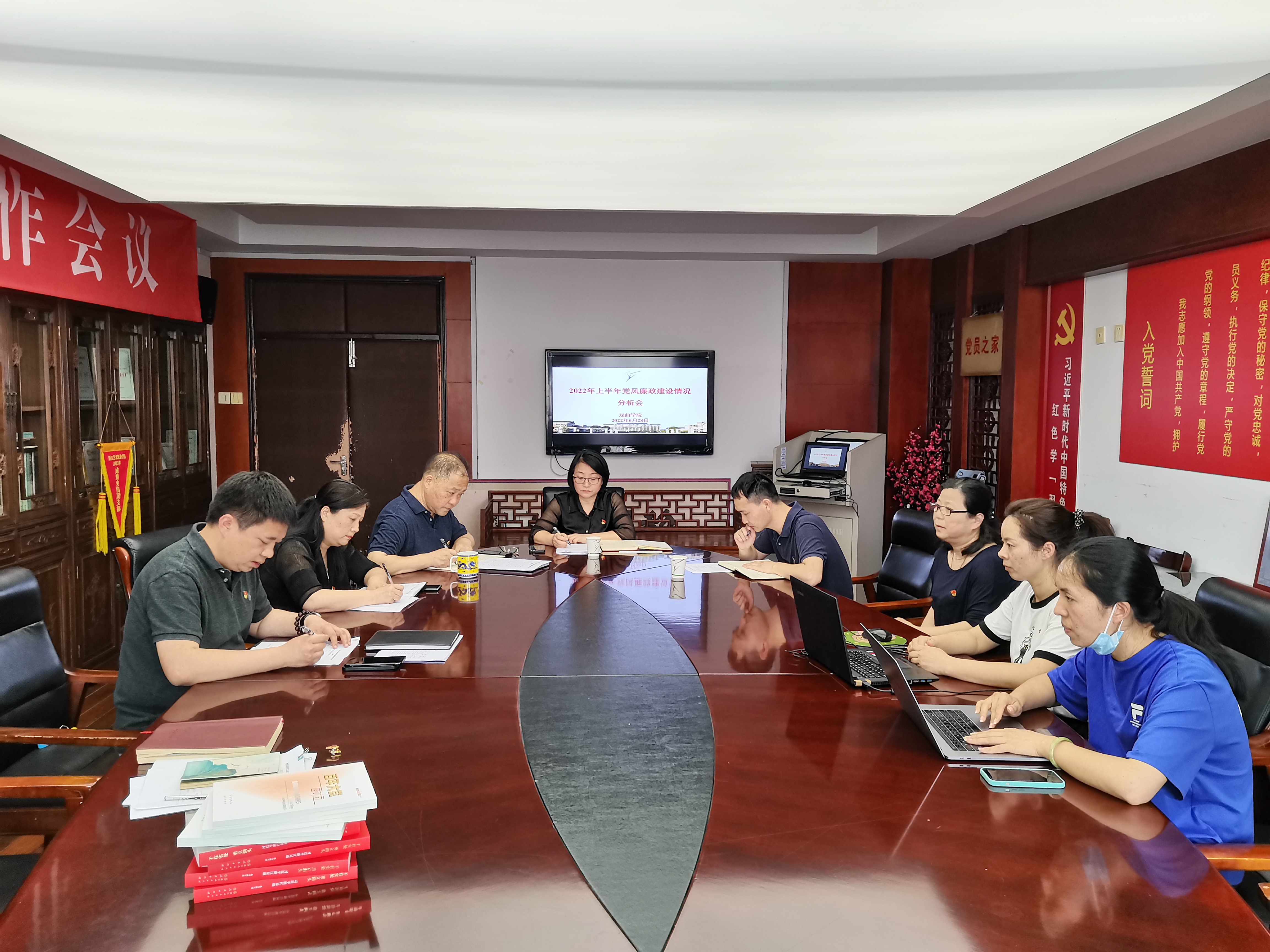 戏曲学院党总支书记、副院长谢青作党风廉政建设情况分析报告。他表示,2022年上半年,戏曲学院牢固树立“党建与业务双融双促”工作理念,坚持以党建引领事业发展,持续推进党史学习教育常态化长效化,着力深化理论武装、夯实基层基础、推进正风肃纪,全面提高党的建设质量,为推进戏曲表演高水平专业群和越剧研究院建设提供坚强有力的组织保证。从加强组织领导、深化信念教育、严守纪律规矩、夯实阵地建设、坚定为民宗旨、提升办学水平等六个方面对戏曲学院半年来的党风廉政建设情况进行了深入分析,肯定成绩、查摆问题、部署整改、明确方向。领导班子其他成员按照各自职责,分析分管范围内的党风廉政建设情况,与会人员作了补充发言。