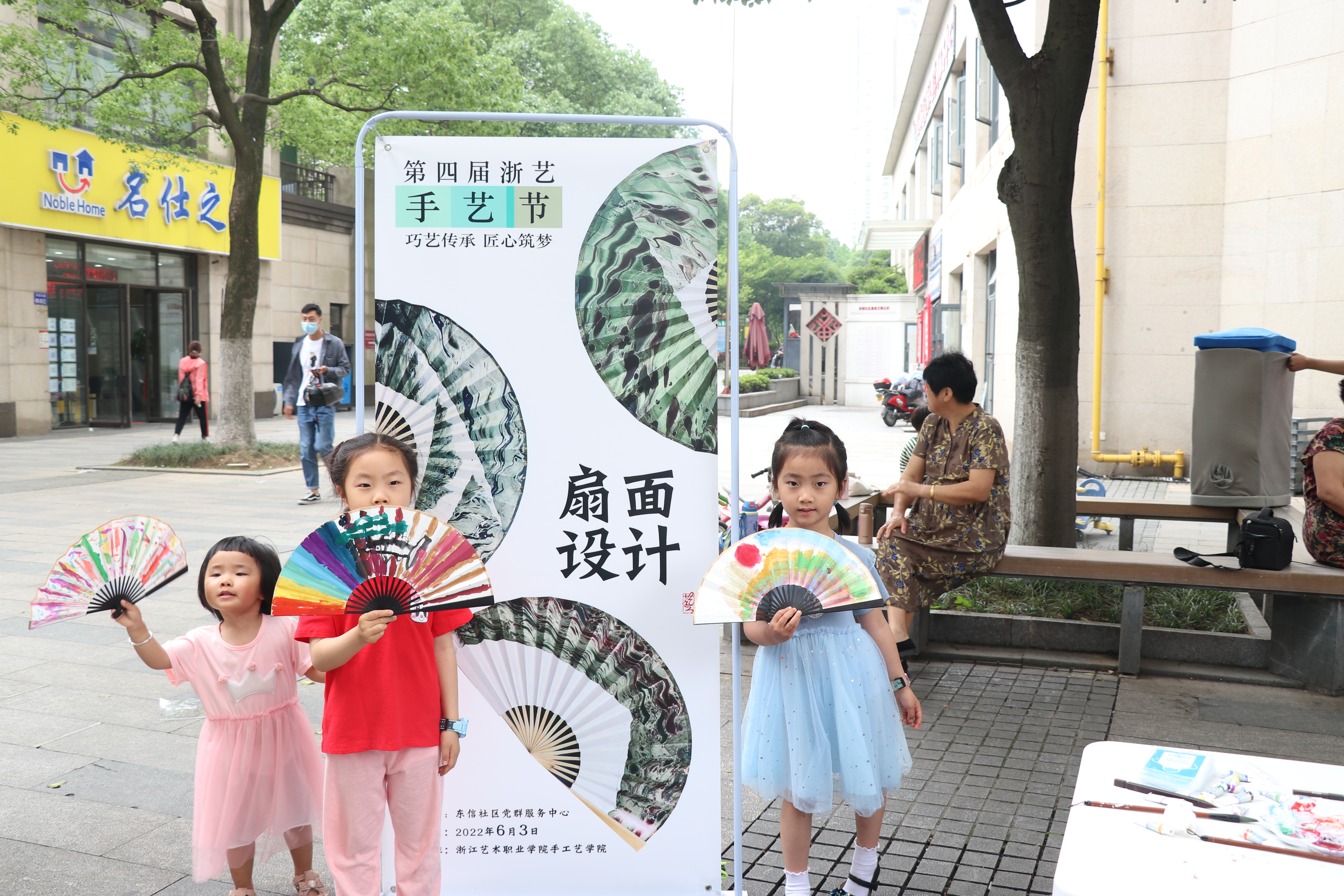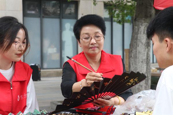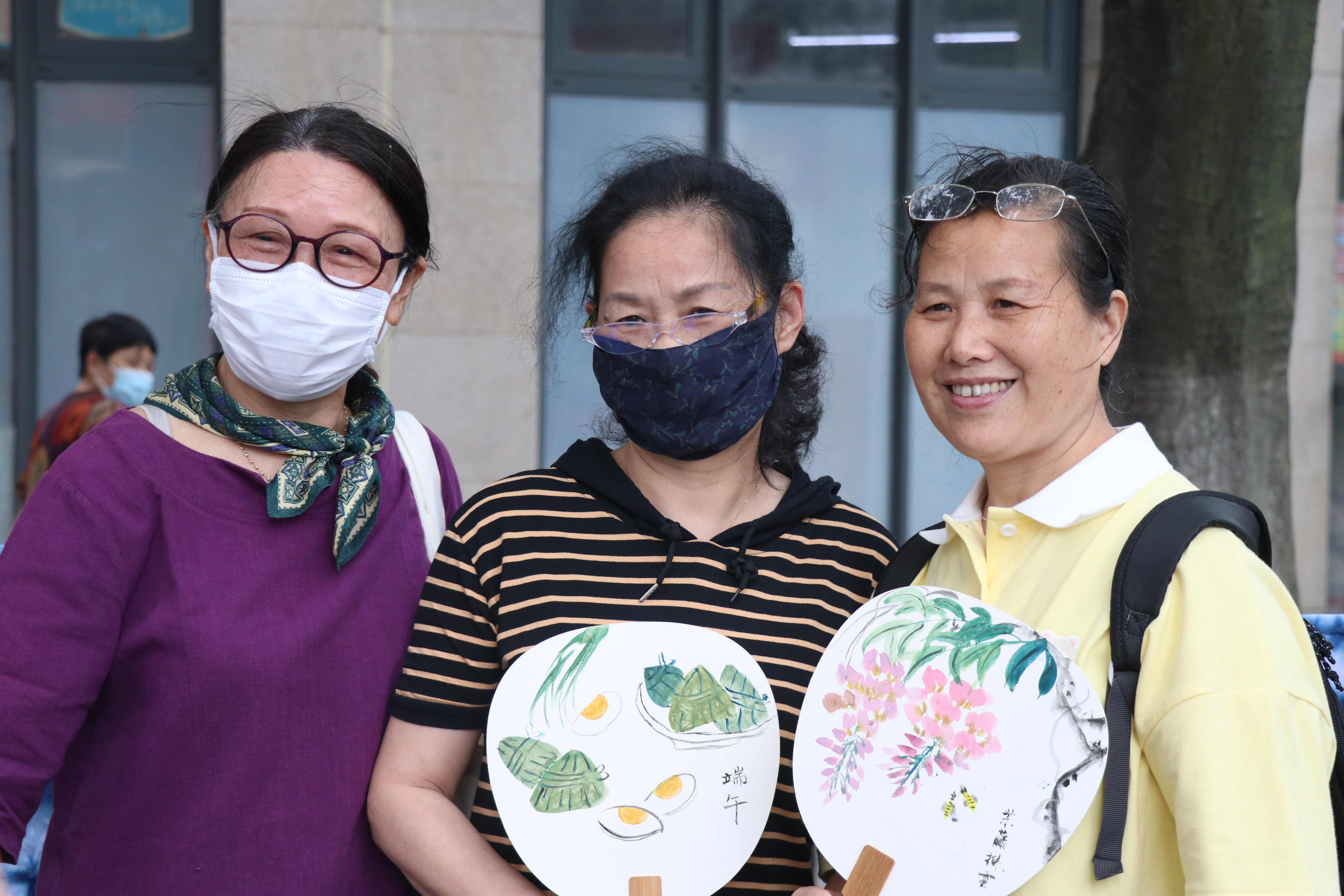 艺小匠们给现场体验者分发绘画工具和扇子,鼓励大家进行自由作画。在长方桌上,男女老少体验者对着空白的扇子聚精会神地描绘,有的画花卉,有的画粽子,有的写祝福,将一幅幅充满端午气氛的画作呈现在一把小小的扇子上。家住社区的耿老师笔法行如流水,扇面作品栩栩如生,一口气创作了四五把精美别致的扇面画。
